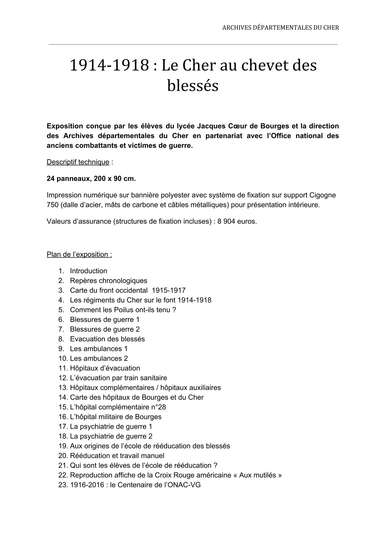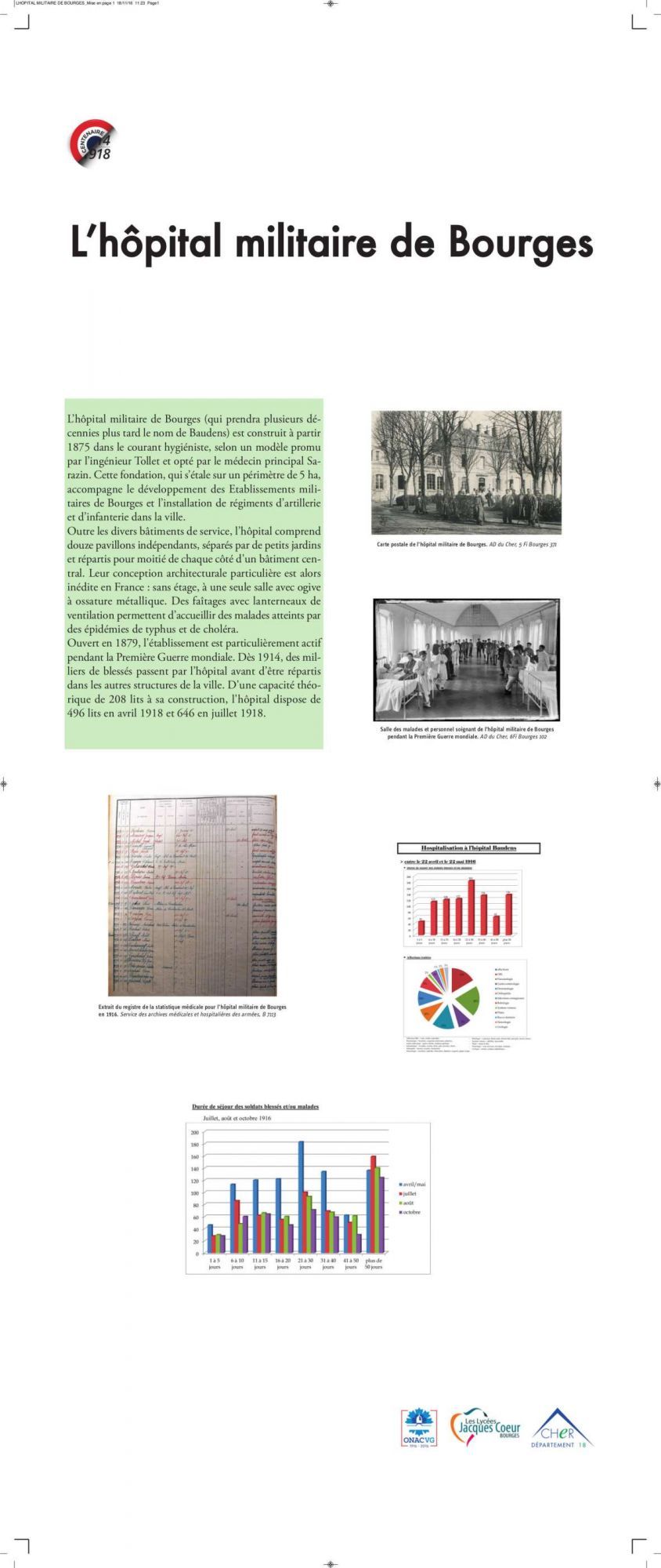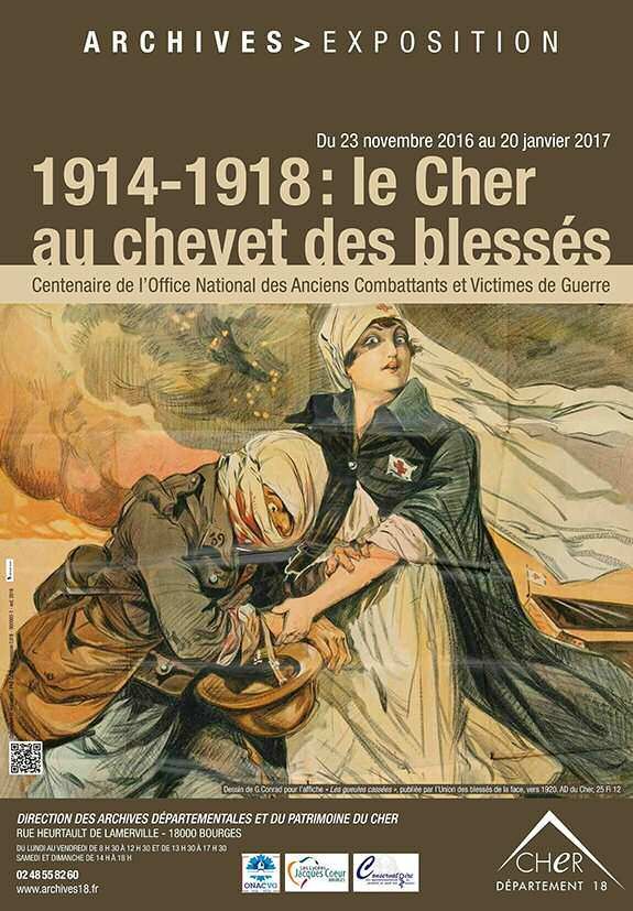 Durant les 4 années du conflit, 30 000 blessés ont été pris en charge dans les 85 hôpitaux du Cher. A travers des photos, des documents d'archives, des objets prêtés par l'ACAPSA et des travaux réalisés par des lycéens de Jacques Coeur au cours de l'années scolaire 2014-2015, l'exposition "1914-1918 : le Cher au chevet des blessés" se propose d'illustrer un aspect méconnu du conflit : la santé et la prise en charge des blessés.