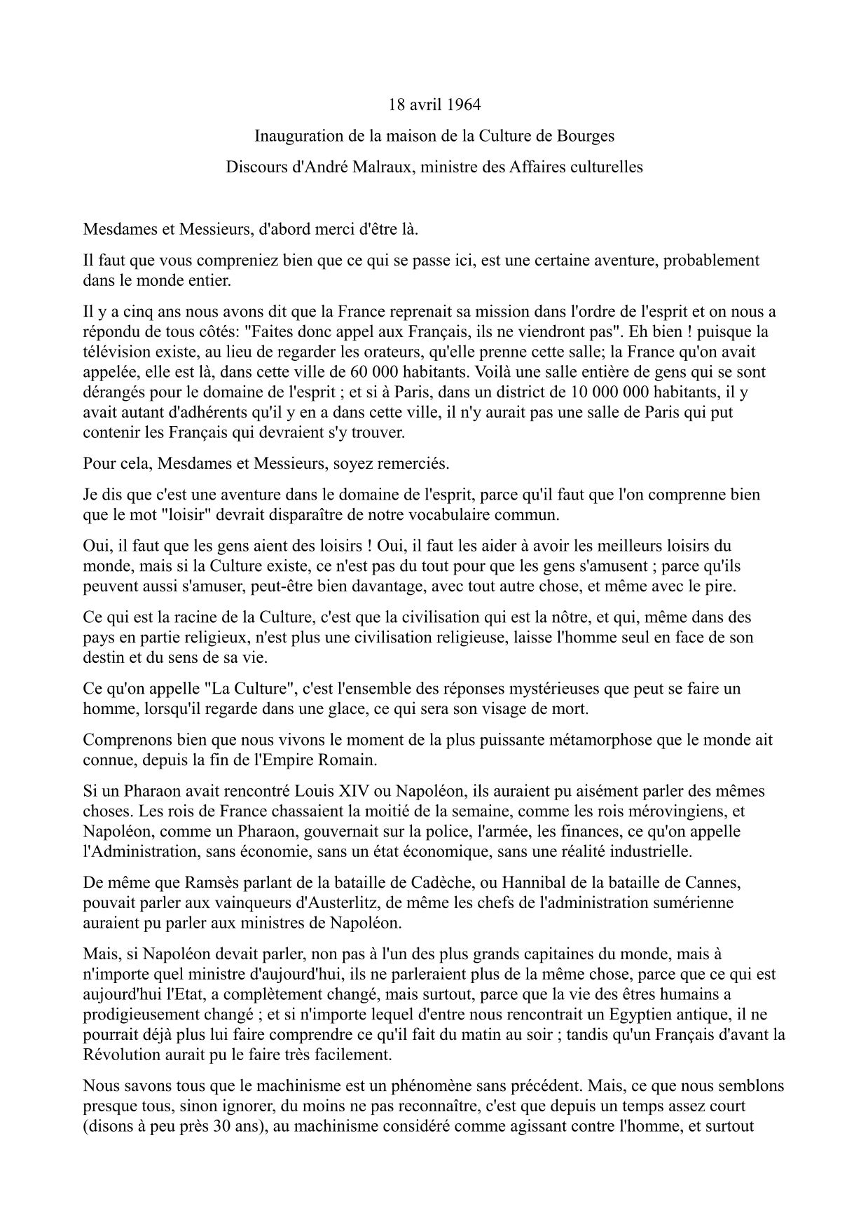 18 avril 1964 : Inauguration de la maison de la Culture de Bourges, écouter les discours