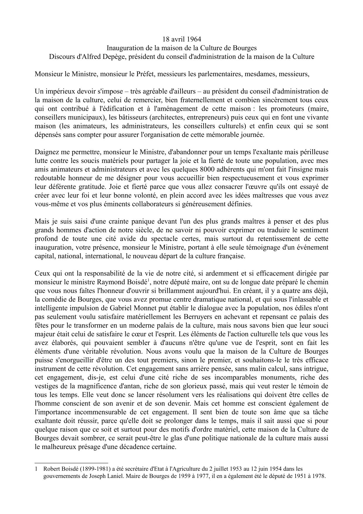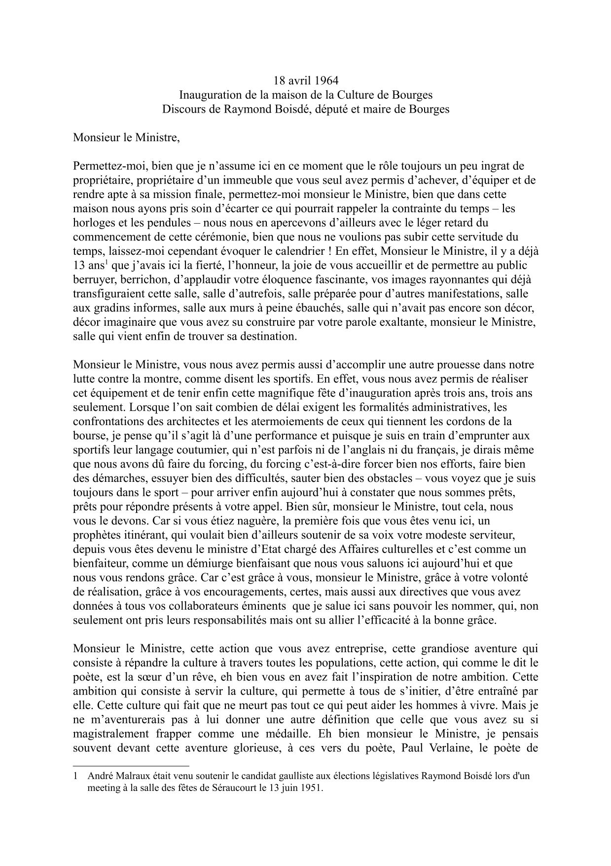 En fin d'après-midi, après une courte réception à l'hôtel de ville, le ministre des Affaires culturelles André Malraux et le maire de Bourges Raymond Boisdé rejoignent la maison de la Culture sur la place Séraucourt où les attendent plus d'un millier de spectateurs. Sur la grande scène du théâtre, Raymond Boisdé est le premier à prendre la parole.