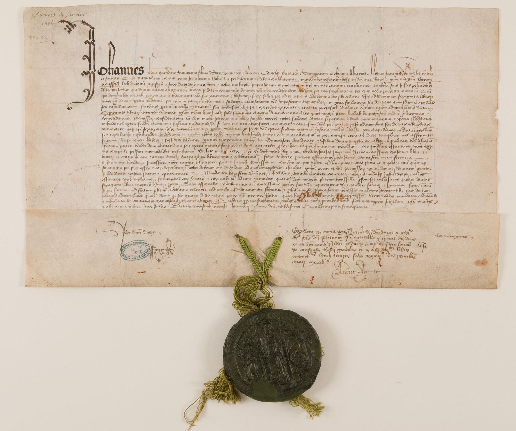 Johannes, regis quondam Francorum filius, dux Bituricen(sis) et Alvernie, comesq(ue) Pictaven(sis), Stamparum, Bolonie (et) Alvernie. Notum facimus universis p(rese)ntib(us) et futuris quod nos, gratuitorum (et) continuorum servitiorum nobis diu per dilectum (et) fidelem consiliarium (et) magistrum requestarum hospicii d(omi)ni mei regis (et) n(ost)r(u)m mag(ist)r(u)m Petrum Trousselli, archidiaconu(m) Parisien(sem), (et) suos dicto d(omi)no meo regi (et) nobis multipl(icite)r impensorum memoriam in n(ost)re mentis examine revolventes, et ob hoc suis justis petitionib(us), illis presertim que divini cultus augmentu(m) a(n)i(m)ar(um)q(ue) salutem concernu(n)t, benigne volentes condescendere, [au]dita per nos supplicatione per eum nobis porrecta, continen(ti) q(uod), cu(m) ip(s)e, dum in hac mortali p(er)egrinatione vitam agit, a(n)i(m)e sue, parentum (et) b(e)n(e)factor(um) suor(um) saluti providere cupiens, de bonis a Deo sibi collatis usq(ue) ad summam sexaginta librar(um) turonen(sium) annui et p(er)petui redditus per ip(su)m in patriis (et) t(er)ris nobis subjectis acquisitarum vel imposterum acquirendar(um) in nova fundatione seu dotatione cujusdam capella(n)ie seu capellaniarum (et) sui obitus p(er)petui in eccl(es)ia Bituricen(si) seu quibusvis aliis piis operibus exponere (et) erogare proposu(er)it, du(m)tamen a nobis gra(tia)m admortisat(i)o(n)is dictar(um) sexaginta librar(um) turonen(sium) obtineat, gra(tia)m n(ost)ram hujusmodi sibi super hoc elargiri dignaremur, nos ip(s)ius mag(ist)ri Petri laudabile propositu(m) in D(omi)no plurimum co(m)mendantes, premissor(um) consideratione, ut idem mag(iste)r Petrus in om(n)ib(us (et) sing(u)lis terris nobis subditis dictas sexaginta libras turonen(sium) annui (et) p(er)petui redditus in feodo vel extra feodu(m), etiam cum justicia media (et) bassa, si jam eas non acquisierit, acquirere (et) eas insimul vel per partes in fundationibus seu dotationib(us) p(re)dictis convertere, q(uod)q(ue) ip(s)e sexaginta libre turonen(sium) annui (et) p(er)petui redditus in feodo vel extra feodum etiam cu(m) justicia media (et) bassa per capellanos in dicta capella(n)ia seu capellaniis instituendos ac decanu(m) et cap(itu)l(u)m ip(s)ius eccl(es)ie in q(u)a(n)tum hujusmodi tangit obitum ac alios quibus per eum sic erogate, date, translate vel assignate fuerint recipi, teneri, haberi et possideri valeant p(er)petuis temporibus tanq(u)a(m) res admortisate, Deo dicate (et) usibus divinis applicate absq(ue) eo q(uod) ad eas vel aliqua(m) ip(s)arum partem vendendum, alienandum seu extra manus suas ponendum aut nobis p(ro)pter hoc aliqua(m) financiam pr(est)andum per quoscu(m)q(ue) officiarios n(ost)ros cogi aut compelli possint quomodolibet in futurum prefato magistro Petro (et) ut ip(s)e d(omi)n(u)s meus rex (et) nos predecessoresq(ue) sui (et) n(ost)ri necnon carissima consors (et) liberi n(ost)ri bonor(um) et orationu(m) que ratione dictar(um) sexaginta librar(um) turon(ensium) celebrabunt(ur) (et) fient decetero p(ar)ticipes efficiamur (et) consortes, de nostra certa sciencia, inq(u)a(n)tum nos, heredes (et) successores n(ost)ros tangit (et) tangere pot(er)it in futur(um), concessimus (et) concedimus per p(rese)ntes. Eidem quoq(ue) mag(ist)ro Petro ex ampliori gr(ati)a qua(m)cunq(ue) financiam pro premissis (et) eor(um) dependentiis nobis debitam aut debendam ad quale(m)cunq(ue) sum(m)am ascendat exnu(n)c prout extu(n)c premissor(um) intuitu damus, remittim(us) penitusq(ue) de dicta nostra sciencia quittamus ; mandantes har(um) serie dilectis (et) fidelibus gentib(us) camere compotor(um) n(ost)ror(um) om(n)ibusq(ue) justiciariis (et) aliis officiariis n(ost)ris modernis (et) futuris vel eor(um) locaten(entibus) (et) eor(um) cuil(ibet) ut ad eum p(er)tinuerit quatin(us) d(i)c(tu)m mag(ist)r(u)m Petrum Trousselli p(er)sonasq(ue) eccl(es)iasticas quibus dictas sexaginta libras turonen(sium) a(n)nui (et) p(er)petui redditus assignabit p(rese)ntibus gratia (et) concessione p(er)petuo sine ulla inquietatione v(est)ri (et) gaudere faciant (et) p(er)mittant, facta i(n) (contr)ariu(m) si que fuerint ad statum p(r)istinu(m) (et) debitum celeriter reducendo. Ordinationib(us), statutis (et) p(ro)hibitionib(us) p(er) nos factis p(re)missis in aliquo derogantib(us) tam de non aliquid admortisando q(u)a(m) al(ia)s donisq(ue) seu graciis dicto mag(ist)ro Petro a(lia)s per nos factis, quas hic [h]aberi volumus pro expressis, necnon aliis mandatis, ordi(n)ac(i)o(n)ib(us) (et) inhibitionib(us) contrariis non obstantib(us) quibuscumq(ue). Quod ut p(er)petue firmitatis robur obti(n)eat, n(ost)r(u)m p(rese)ntibus l(itte)ris fecimus apponi sigillum, n(ost)ro in aliis (et) alieno in omnibus jure salvo. Datum Parisius, mense januarii, anno D(omi)ni millesimo quadringentesimo quarto.