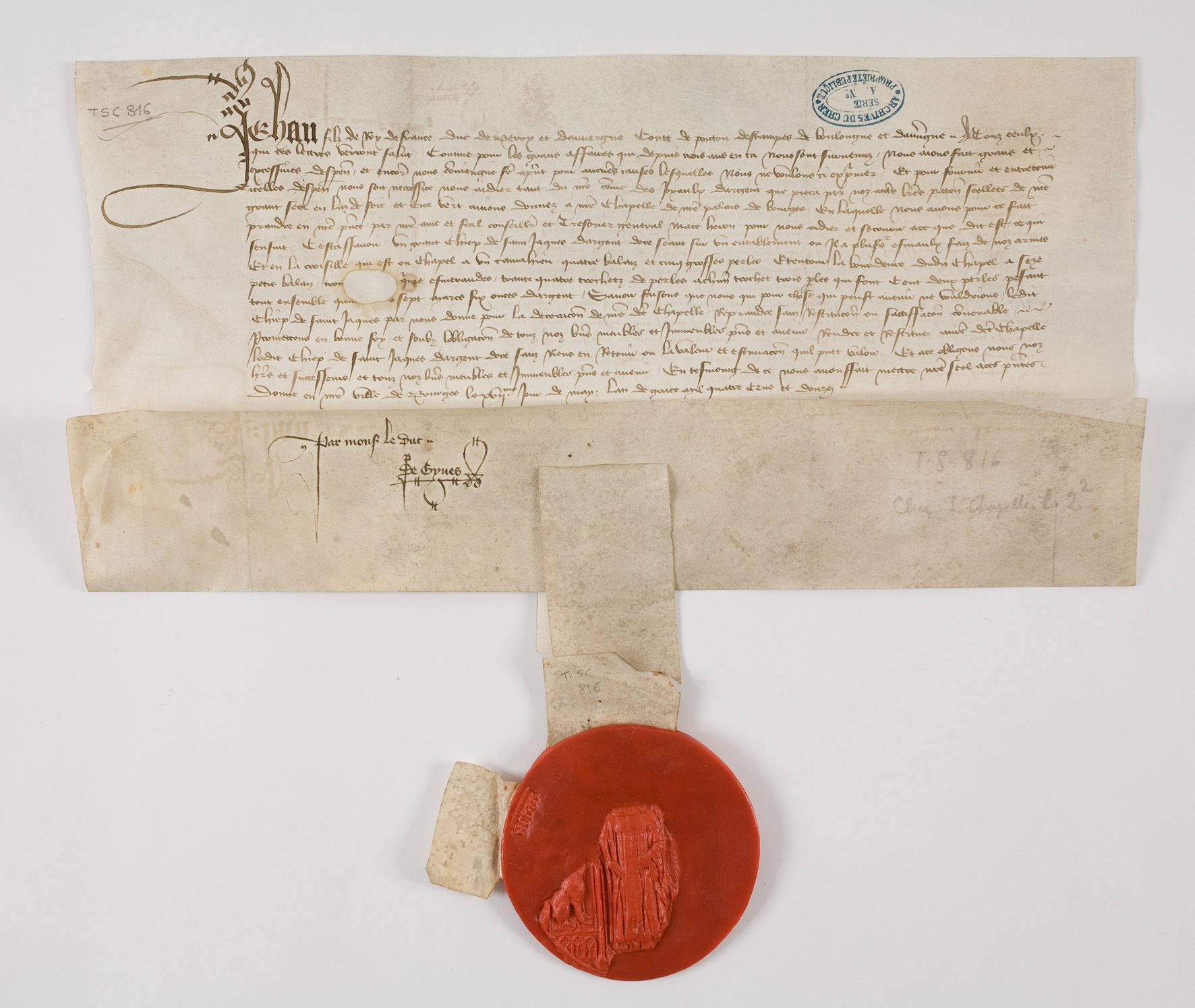 Jehan, filz de roy de France, duc de Berry et d’Auvergne, conte de Poictou, d’Estampes, de Boulongne et d’Auv(er)gne, a touz ceulx qui ces lettres verront, salut. Comme pour les grans affaires qui depuis trois ans en ça nous sont survenuz nous aions fait grans et excessives despen(ces) et encor(re) nous co(n)viengne fe(re) a p(rese)nt pour aucu(n)es causes, lesquelles nous ne voulons ci exp(r)imer, et pour fournir et entretenir icelles despen(ces) nous soit neccessité nous aidier, tant du n(ost)re com(m)e des joyaulx d’argent que pieça par noz aut(re)s l(ett)res paten(tes) seellees de n(ost)re grant seel en laz de soie et cire vert avions donnez a n(ost)re chapelle de n(ost)re palais de Bourges, en laquelle nous avons pour ce fait prandre en n(ost)re p(rese)nce par n(ost)re amé et feal conseill(ie)r et tresorier general Macé Heron, pour nous aidier et secourir a ce que dit est, ce qui s’ensuit, c’est assavoir un grant chiep de saint Jaques d’argent doré, seant sur un entablement ou il a plus(ieur)s esmaulx faiz de noz armes, et en la croisillequi est ou chapel a un camahieu, quatre balaizet cinq grosses perles, et entour la bourdeure dudit chapel a seze petis balaiz, tro[is saphirs], q(ui)nze esmeraudes, trante quatre trochetz de perles, a ch(asc)un trochet trois p(er)les, qui font cent deux perles, pesant tout ensemble qua[tre vins]sept marcs six onces d’argent. Savoir faisons que nous qui, pour chose qui peust avenir, ne vouldrions ledit chiep de saint Jaques par nous donné pour la decorac(i)on de n(ost)red(ic)te chapelle reprandre sanz restituc(i)on ou sattiffac(i)on co(n)venable, promettons en bonne foy et soubz l’obligac(i)on de touz noz b(i)ens, meubles et immeubles, p(rese)ns et a venir, rendre et restituer a n(ost)redicte chapelle ledit chiep de saint Jaques d’argent doré sanz rens en retenir, ou la valeur et estimac(i)on qu’il puet valoir ; et a ce obligons nous, noz h(oi)rs et successeurs et touz noz b(i)ens, meubles et immeubles, p(rese)ns et a venir. En tesmoing de ce, nous avons fait mectre n(ost)re seel a ces p(rese)ntes. Donné en nostre ville de Bourges, le XVIIme jour de may, l’an de grace mil quatre cens et douze.
