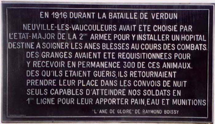Ceux qui servent à Verdun disposent d'un hôpital installé à Neuville-lès-Vaucouleurs (Meuse, environ 80 km au sud de Verdun). Fin des années 1990, une plaque en leur mémoire est installée dans cette commune par Raymond BOISSY. Et le 30 juillet 2016, c'est un monument à la mémoire des ânes morts au cours de la Première Guerre mondiale qui est inaugurée.