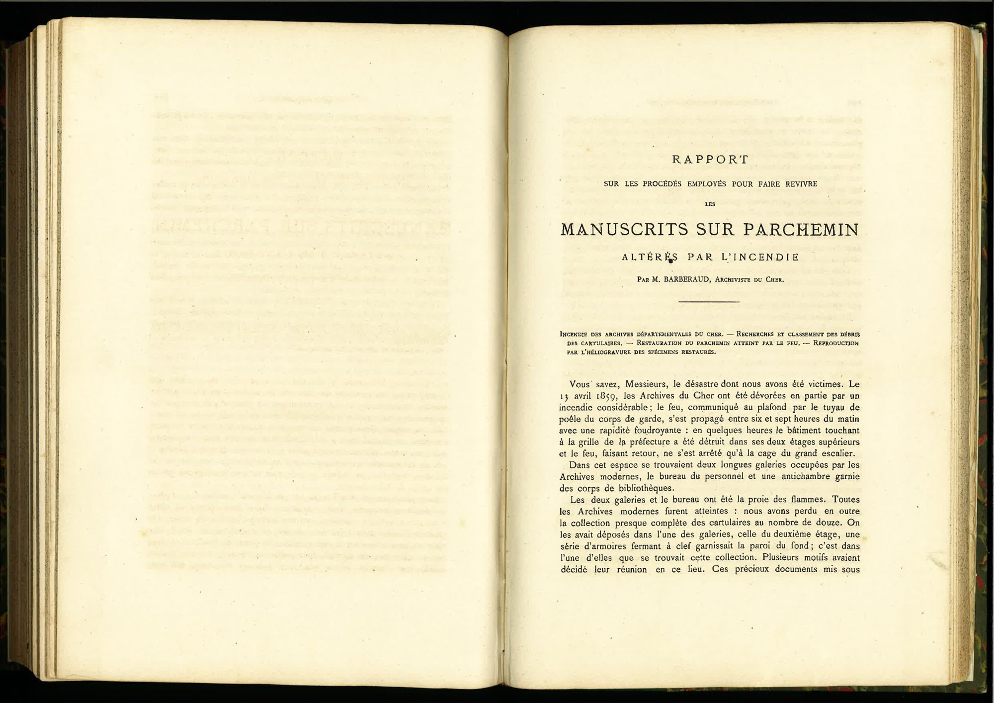 Le directorat de Charles Barberaud est malheureusement marqué par un tragique événement pour les archives départementales. Dans la nuit du 13 avril 1859, un incendie se déclare dans les locaux qu'elles occupent à l'hôtel de la Préfecture. De nombreux documents administratifs collectés récemment, ainsi que de précieux cartulaires provenant des abbayes du Cher et de la cathédrale sont gravement endommagés, voire anéantis. Dans les années qui suivent, Charles Barberaud consacre tous ses efforts à récupérer les archives évacuées des gravats à la va-vite et à reconstituer les parchemins altérés en les restaurant et en les photographiant. Un article paru en 1878 dans les Mémoires de la Société historique du Cher fait la synthèse de ces tentatives. On ne peut s'empêcher de frémir en lisant la description des techniques utilisées, beaucoup plus invasives que celles qui sont aujourd'hui en usage parmi les professionnels de la restauration.