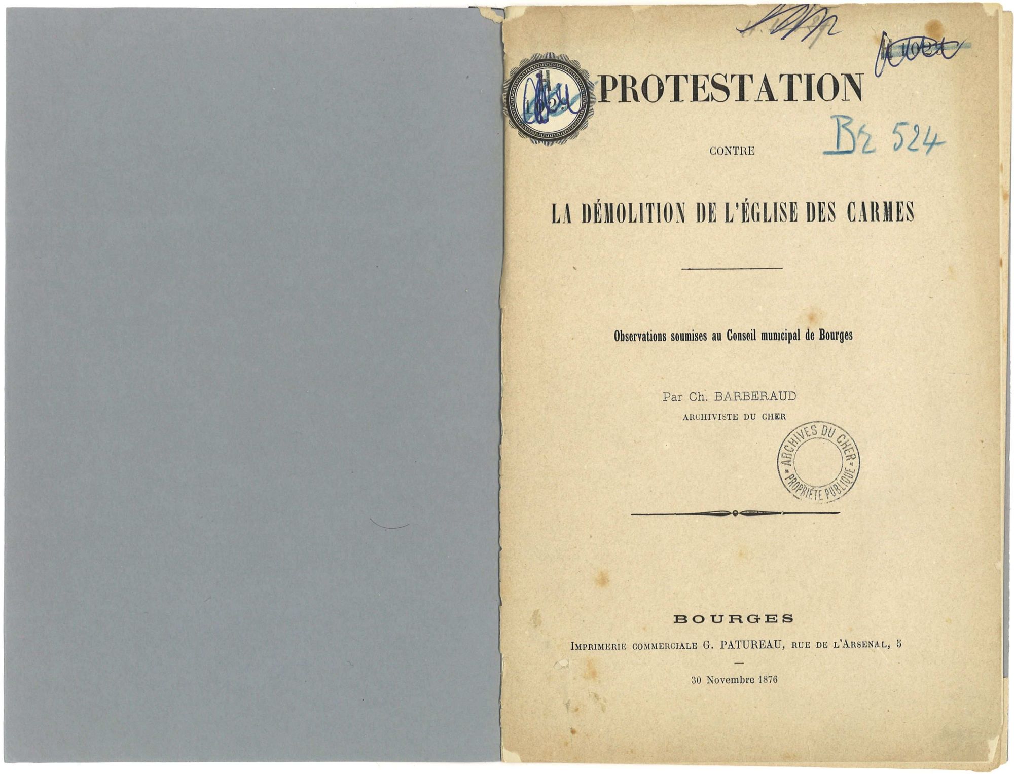 Charles Barberaud est aussi connu pour son engagement en faveur du patrimoine. En 1876, il fait paraître une Protestation contre la démolition de l'église des Carmes, sorte de lettre ouverte adressée au conseil municipal de Bourges qui a décidé la destruction de cet édifice médiéval, sur l'actuelle place Cujas. L'archiviste souligne la qualité architecturale du monument, sévère mais rehaussé par de beaux détails. Il plaide pour qu'y soient transférées les collections du musée, alors présentées dans une maison particulière, avec un bail précaire, à l'emplacement de l'actuel hôtel d'Angleterre. Ironie de l'histoire, il conteste au passage l'opportunité d'installer le musée dans l'hôtel Cujas, préférant y implanter la faculté de droit dont il appelle de ses voeux la résurrection à Bourges ! La plupart de ses idées sont reprises et développées dans une nouvelle brochure publiée l'année suivante sous l'égide des trois sociétés savantes locales : la Société des antiquaires du Centre, la Société historique du Cher et le Comité diocésain d'art et d'archéologie. Cette mobilisation érudite reste sans effet puisque l'église des Carmes est démolie en 1878. Un nouvel édifice prend sa place, quelques années plus tard, pour héberger l'Ecole des beaux-arts et des arts appliqués à l'industrie, avant d'être à son tour livré aux bulldozers en 1976. Le réaménagement de la place Cujas est toujours à l'ordre du jour.