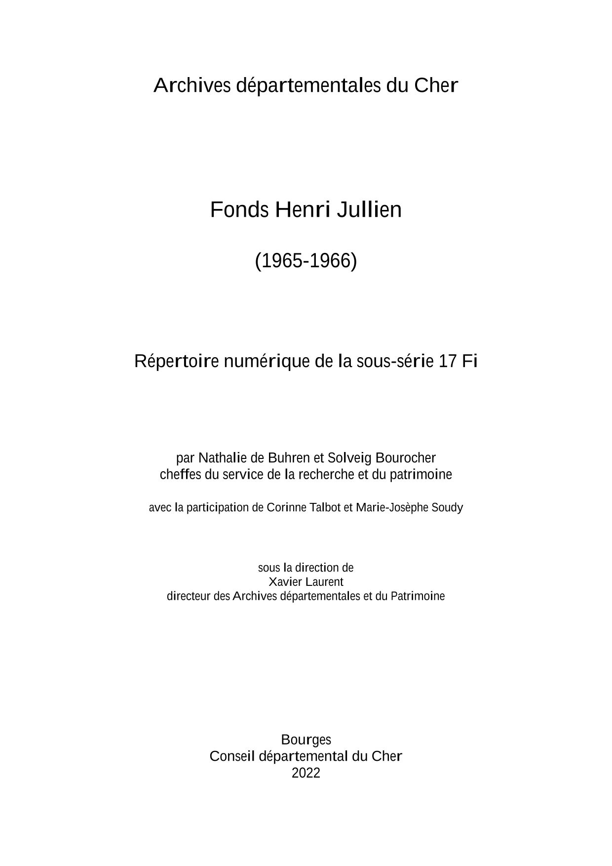 Henri Jullien, diplômé de l’école des Beaux-Arts de Paris en 1923 et nommé architecte en chef des Monuments historiques en 1942, se voit confier la mise en place des secteurs sauvegardés des villes de Bourges et de Nice dans les années 1960. Plusieurs documents (études, directives, règlements, profils et plans) conservés aux archives départementales dans la série J renseignent l’implantation du secteur sauvegardé de Bourges. Ils sont à mettre au regard des 8 443 clichés réalisés entre 1965 et 1966 dans les108 rues, avenues, places et impasses du centre-ville concernées par l’étude.