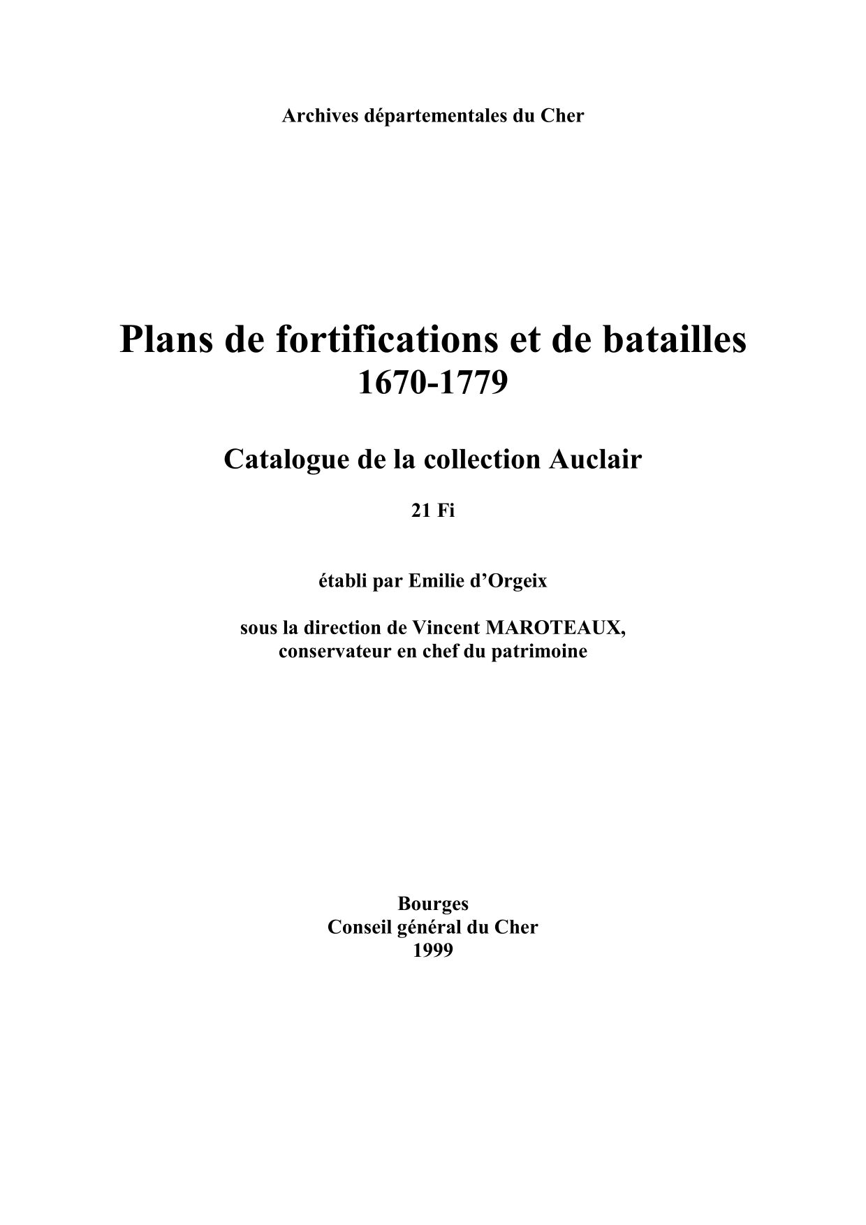 Les Archives départementales du Cher conservent une exceptionnelle collection de plans de fortifications et de batailles datant des XVII° et XVIII siècles, la collection Auclair (21 Fi), déposée avec le fonds de l'ancienne société des Antiquaires du Centre.