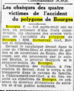 Il s'agissait d'une explosion au polygone de tir, le 30 avril 1935. Quatre victimes, toutes employées aux établissements militaires : Henri Dumarçay, 50 ans et Maurice Gilardeau, 29 ans, inhumés au cimetière Saint-Lazare, François Giet, 51 ans, inhumé au cimetière des Capucins et Fernard Bernet, 42 ans, inhumé au cimetière de Châteauneuf-sur-Cher. Les obsèques ont eu lieu le 2 mai 1935. Les quatre cercueils avaient été exposés à l'hôpital général rue Gambon pour un hommage officiel.