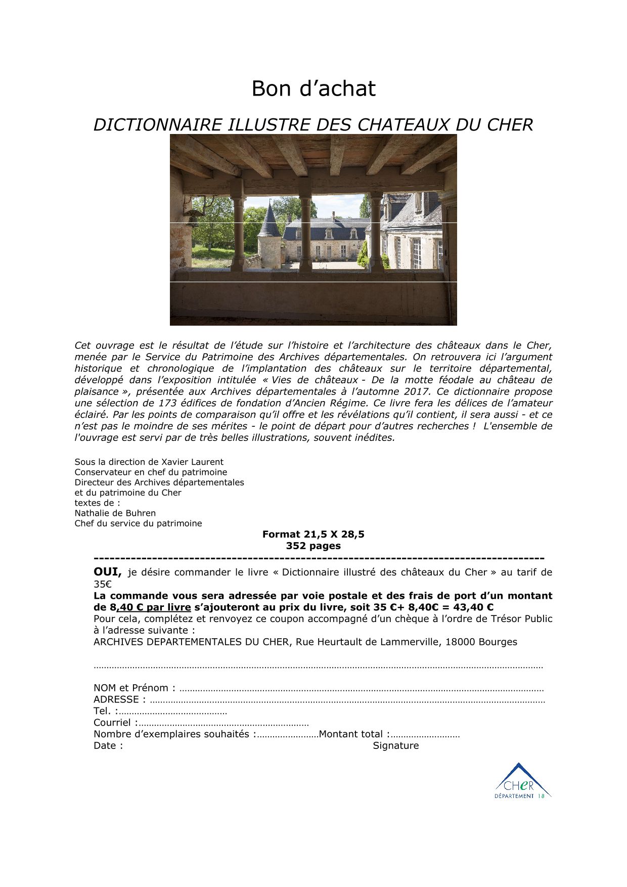 Le Dictionnaire illustré des châteaux du Cher édité en 2019 par les Archives départementales, a fait l'objet d'une deuxième édition en 2020.