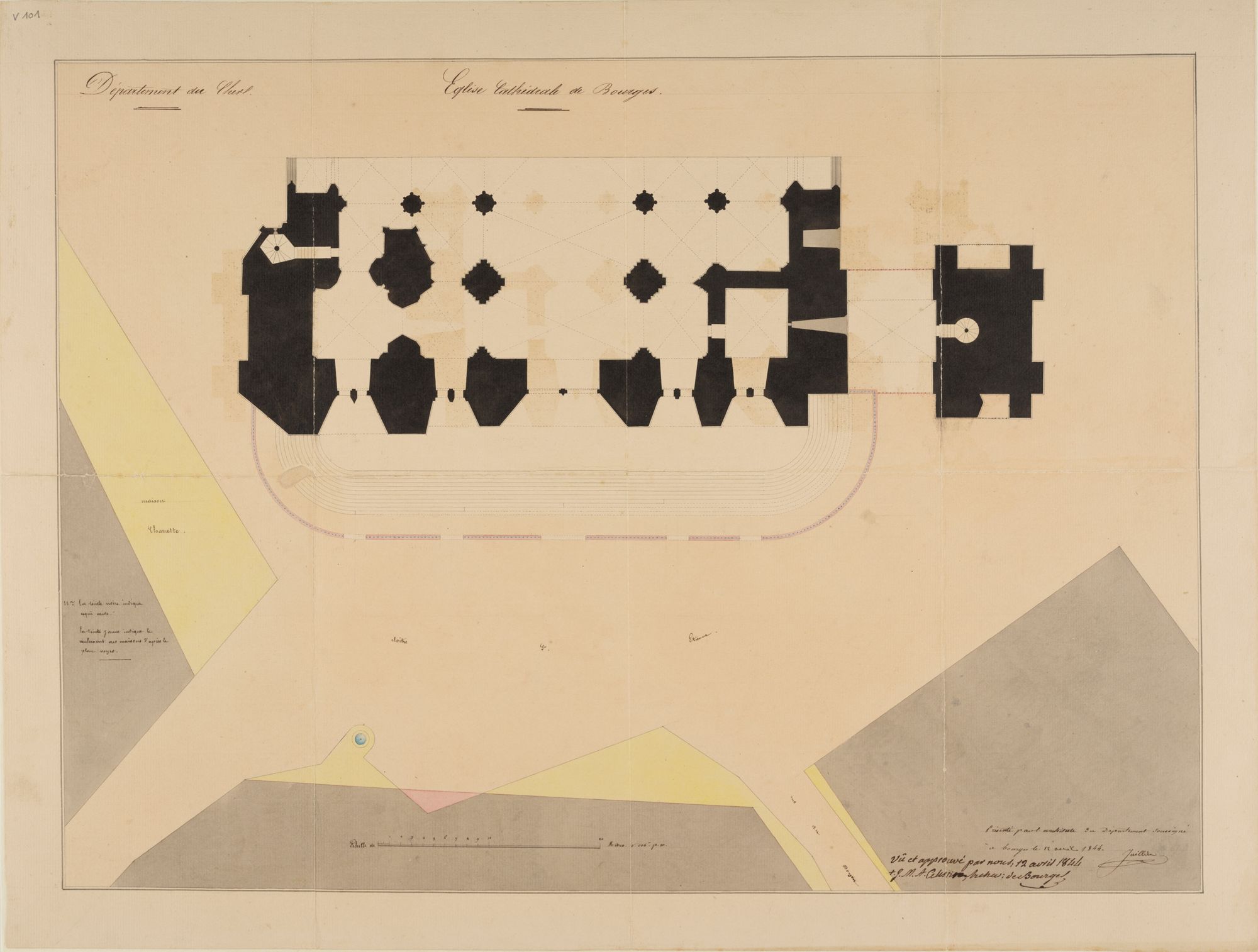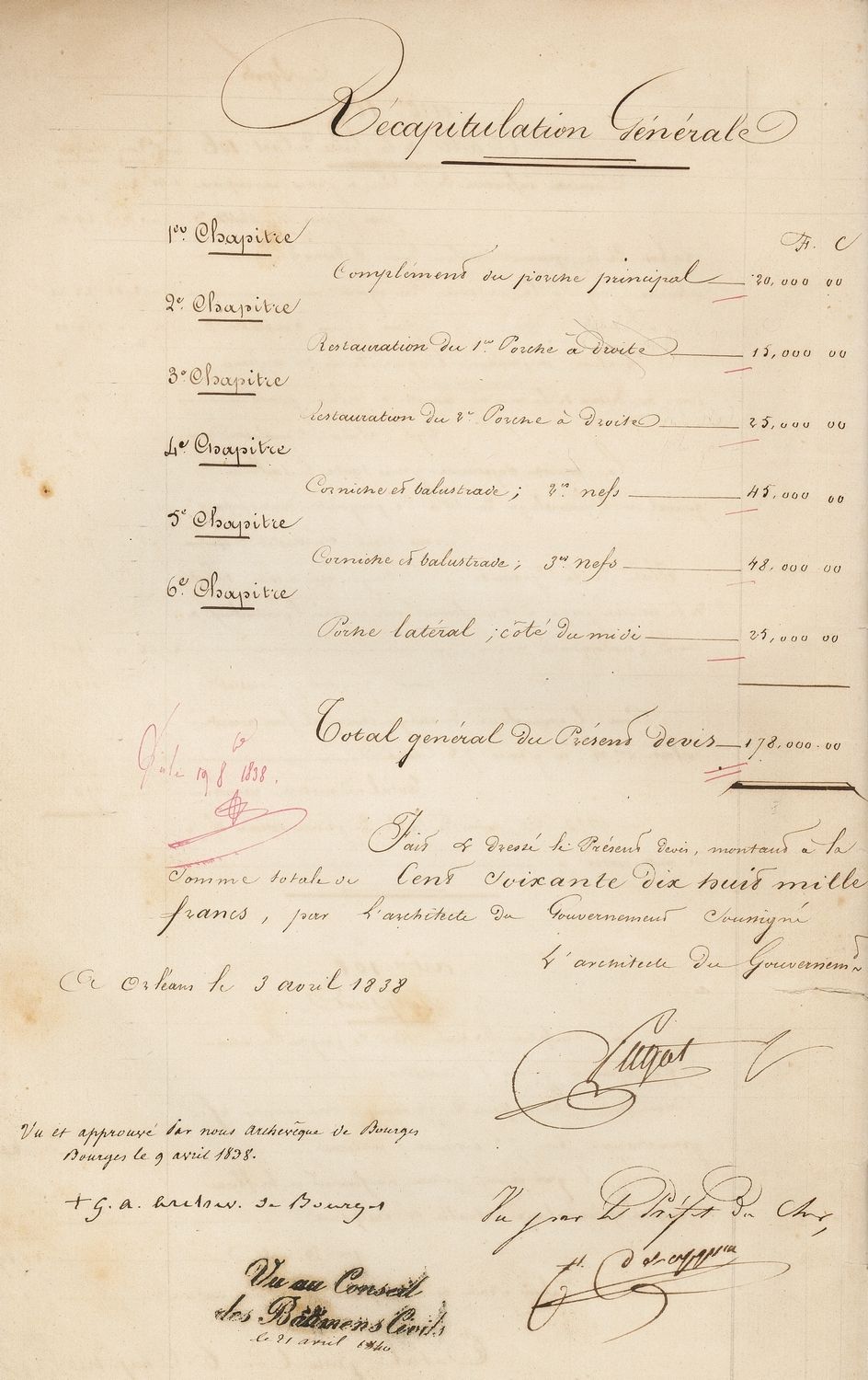 « Les traits tracés à l’encre rouge indiquent les restaurations proposées par l’architecte du gouvernement soussigné ».