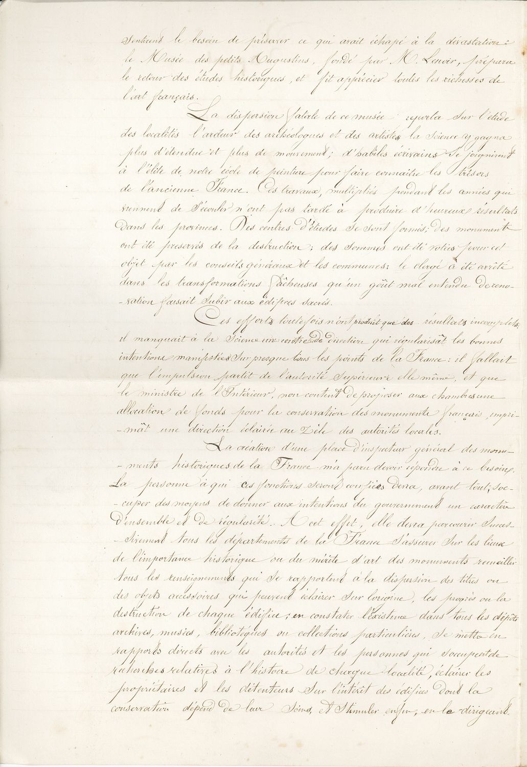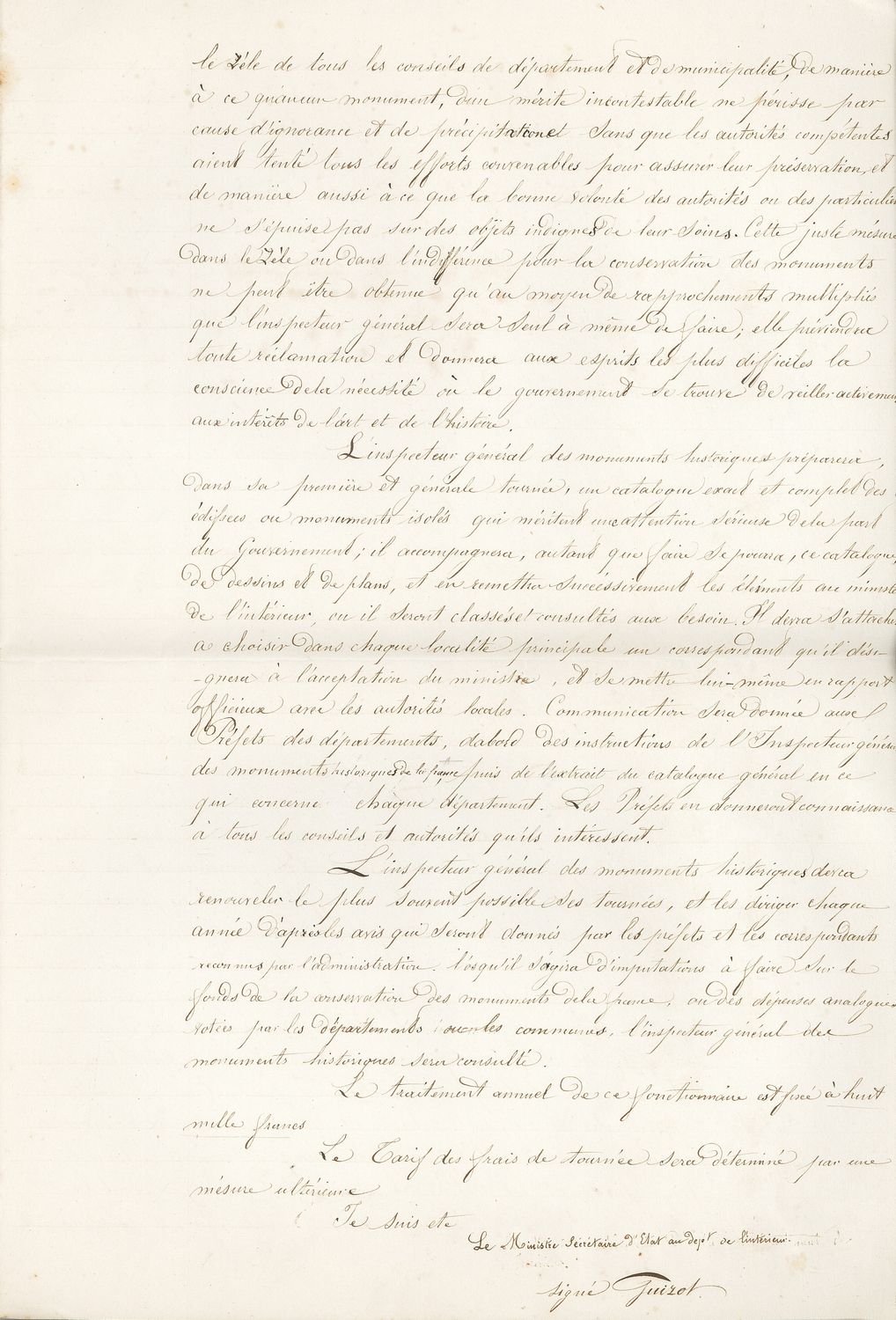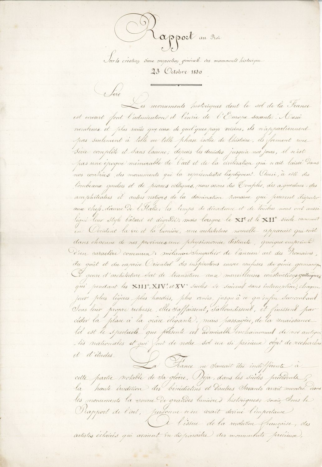 La « commission des monuments » créée en 1790 est une première pierre de la politique patrimoniale nationale, mais c’est sur le rapport de 1830 de François Guizot, ministre de l’Intérieur, qu’est institué l’embryon du service des monuments historiques. Guizot obtient la nomination d’un inspecteur général des monuments historiques chargé de sauvegarder « l’admirable enchaînement de nos antiquités nationales ».