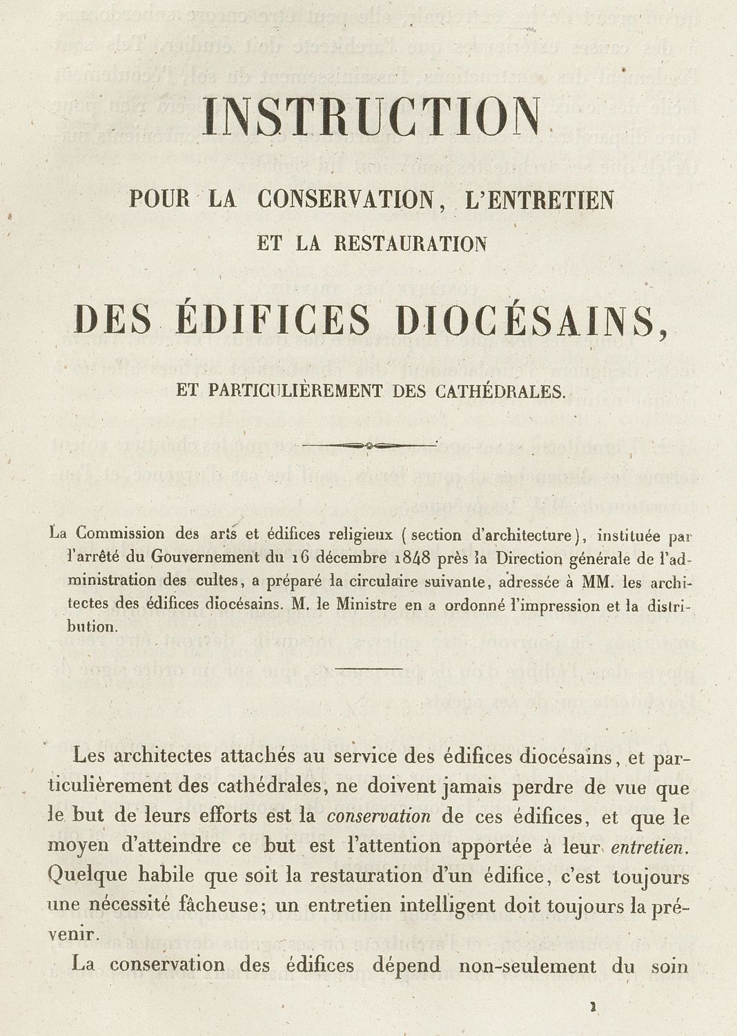 En 1848, des instances sont créées pour mettre en œuvre une pratique uniforme sur tout le territoire : la Commission des arts et édifices religieux reprend la politique de travaux sur les édifices cultuels du Conseil des bâtiments civils ; le corps des architectes diocésains relaie les préfets. Les règles d’élaboration des projets, d’exécution des chantiers, de rédaction et de contrôle des mémoires des travaux se renforcent.