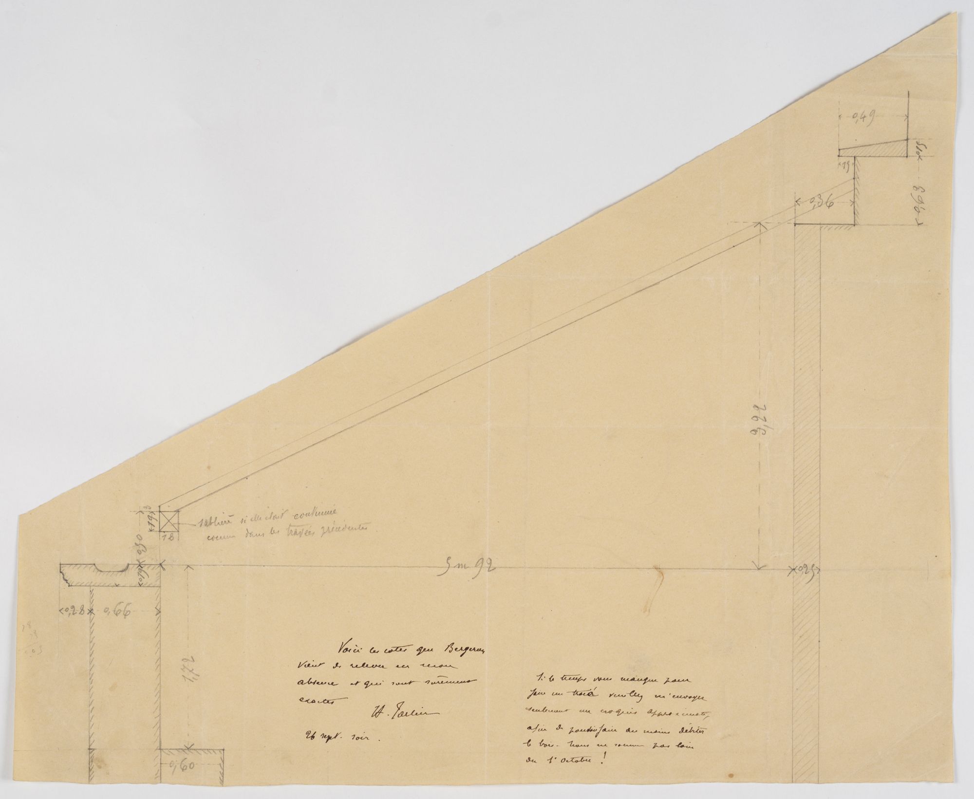 « Voici les cotes que Bergeron vient de relever en mon absence et qui sont sûrement exactes. Si le temps vous manque pour faire un tracé, veuillez m’envoyer seulement un croquis approximatif, afin de pouvoir faire au moins débiter le bois. Nous ne sommes pas loin du 1eroctobre ! ».