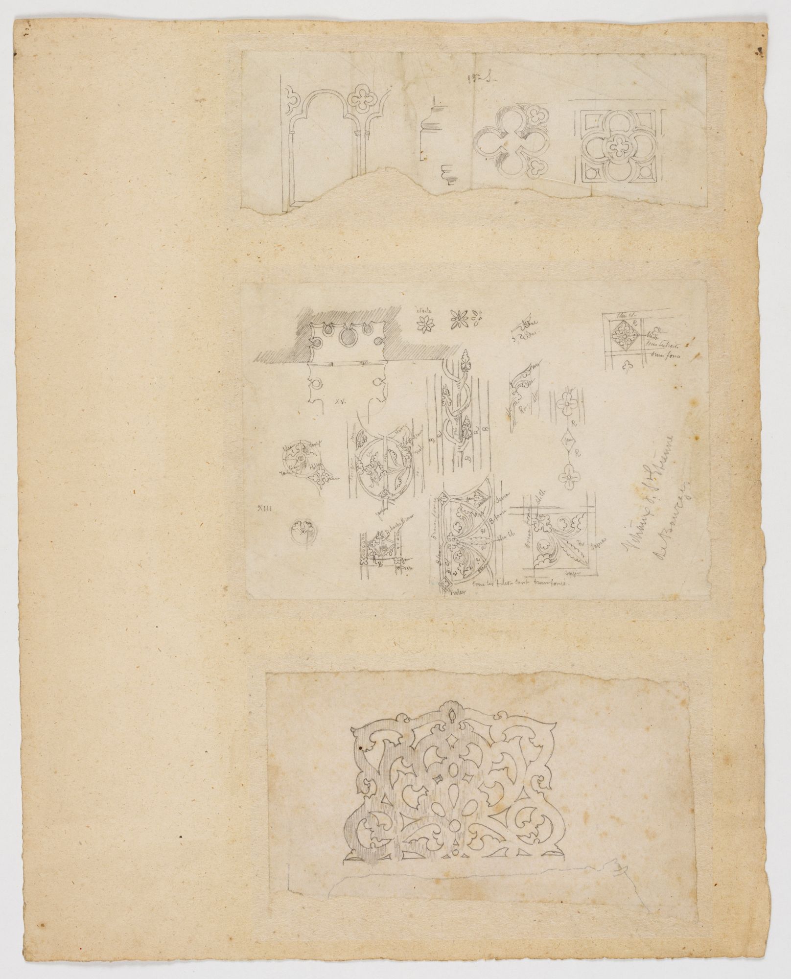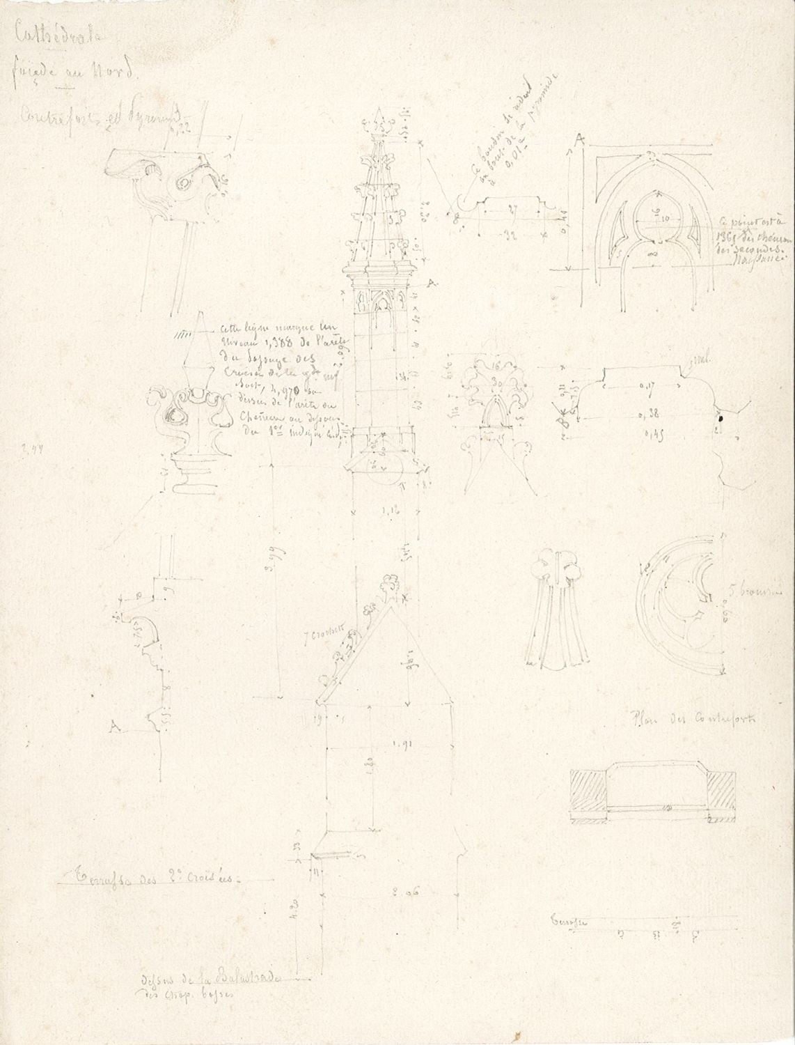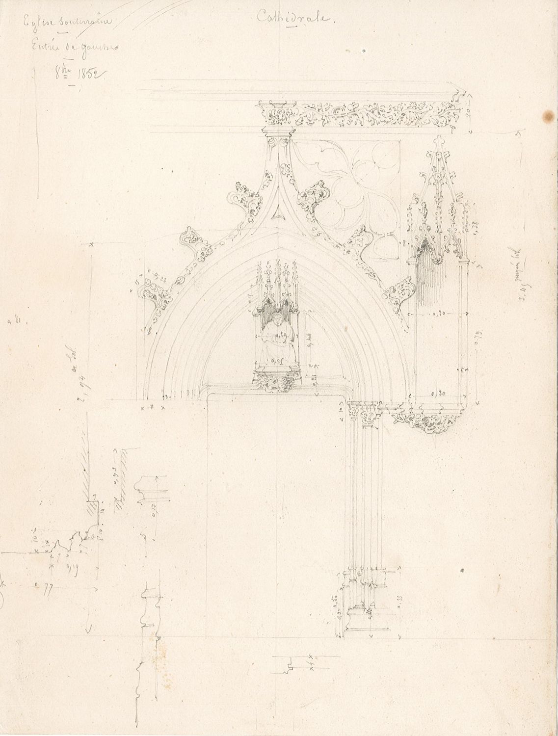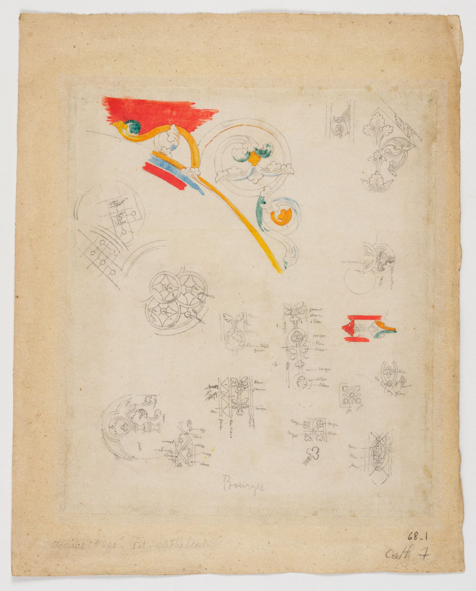 Gay et Dumoutet partagent un intérêt pour l’archéologie et l’étude minutieuse du monument. Le premier publie un Glossaire archéologique du Moyen Âge et de la Renaissance entre 1882 et 1887, après plus de vingt ans de préparation. Le second réalise de nombreux dessins et croquis précis des éléments architecturaux de la cathédrale de Bourges, des détails des sculptures et des vitraux, accompagnés de notes et réflexions personnelles qui serviront à la rédaction d’une monographie.
