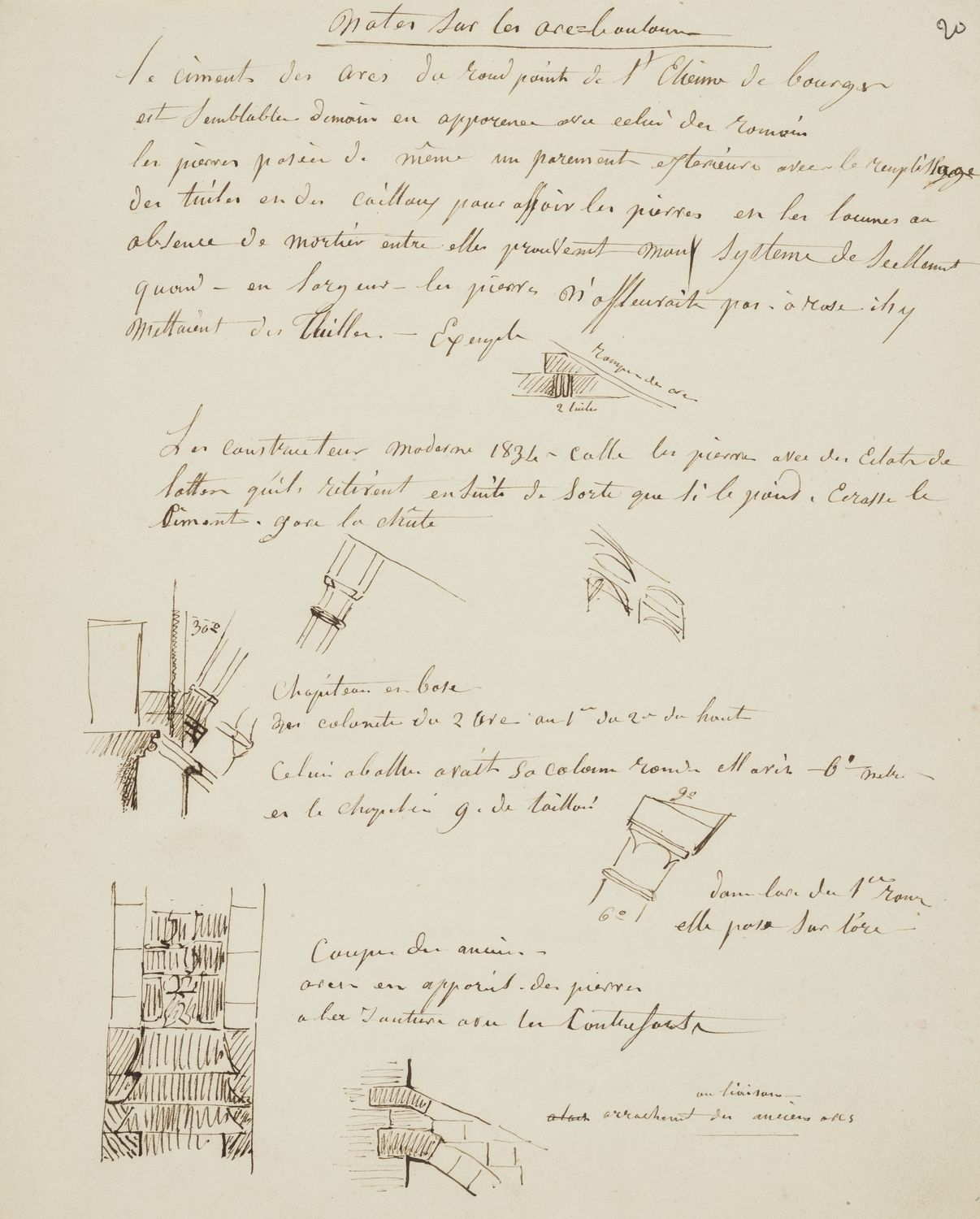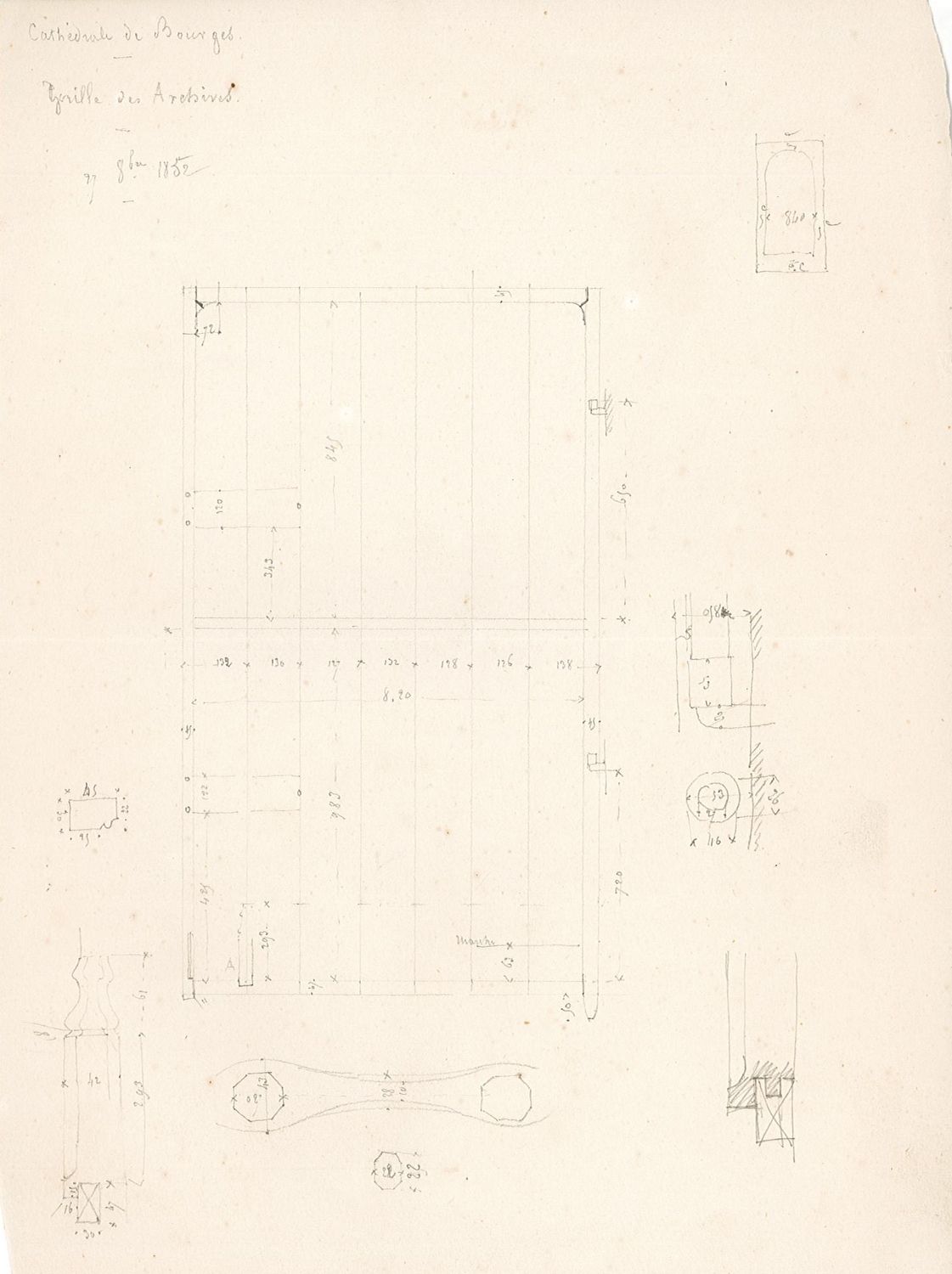 Le premier plan, approuvé successivement par l’archevêque de Bourges, le préfet du Cher, la Commission des arts et édifices religieux et la Direction générale de l’administration des cultes, entre le 27 août et le 12 octobre 1849, montre en jaune les murs en parpaings à démolir (qui seront remplacés par une nouvelle clôture de chœur). Le second a été annoté et signé au crayon à papier par Léonard Hippolyte Roger, inspecteur sur le chantier.