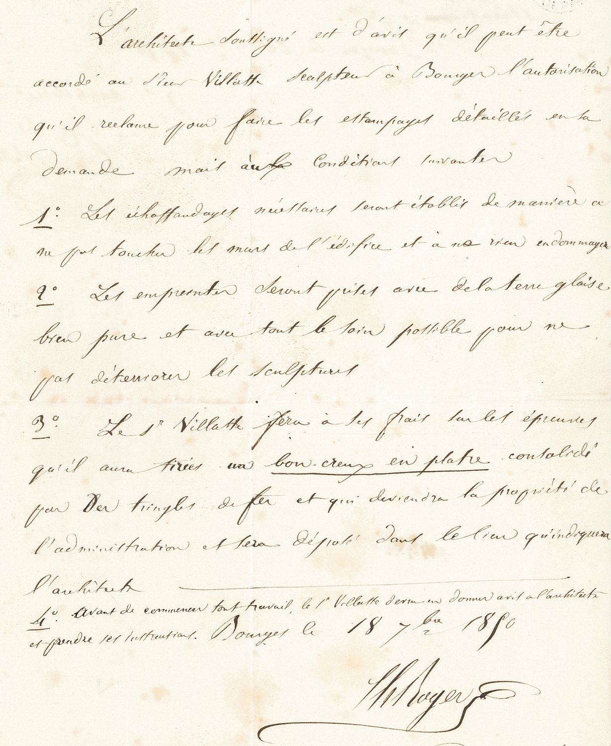 Outre les dessins, les sculpteurs réalisent parfois des moulages d’éléments à restaurer qui leur servent de modèles fidèles en trois dimensions. Barthélemy Juillien et ses successeurs font appel à Caudron, Dumoutet et Villatte qui pratiquent cette technique. Celle-ci consiste à estamper à la terre les pierres sculptées, protégées par une couche de savon, de graisse ou de cendre, puis de couler dans le creux du plâtre mêlé à de la filasse. D’après le baron Auguste-Théodore de Girardot qui guide les restaurations, Théophile Caudron va jusqu’à verser dans les plâtres le ciment « qu’il adapt[e] sur la partie à restaurer au moyen de goujons en fer ».
