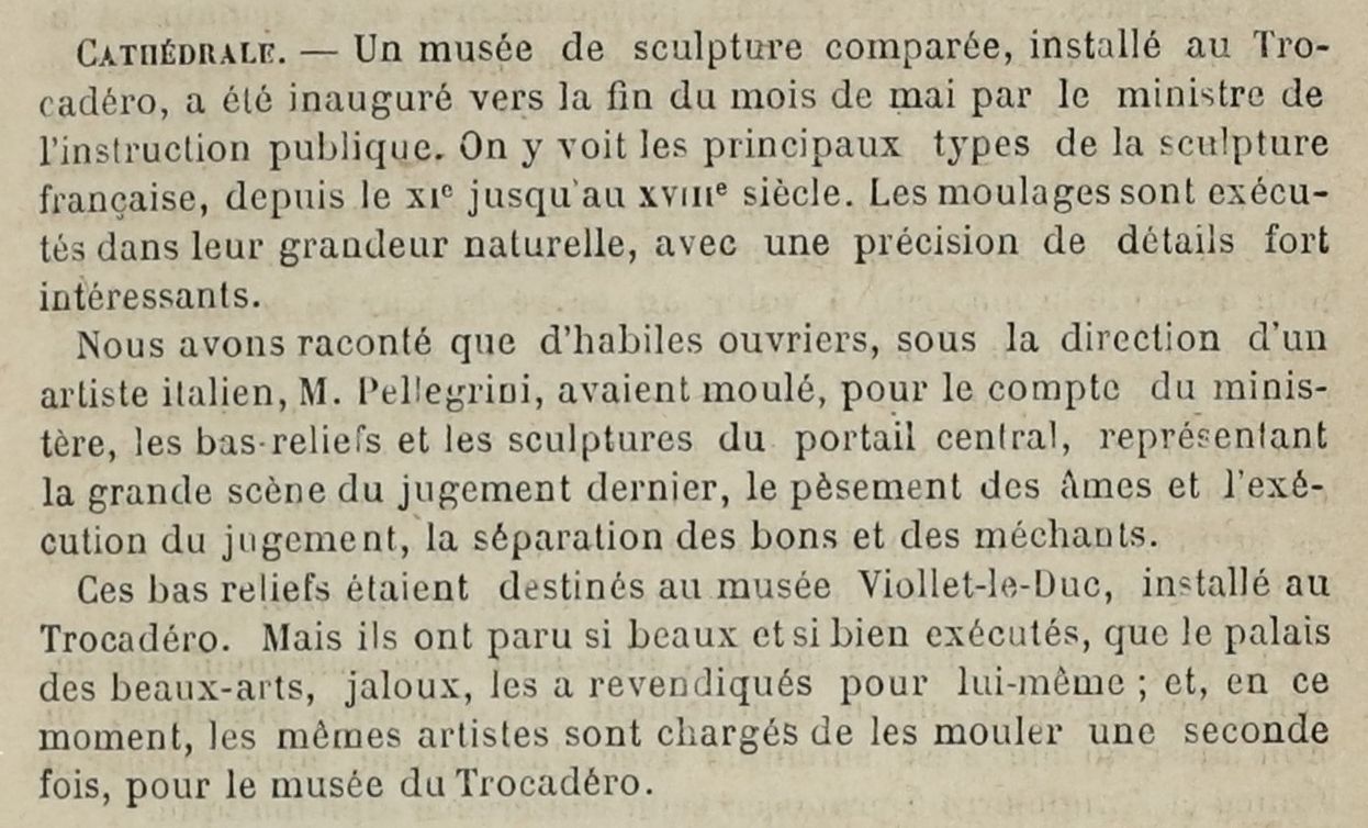 En 1882, année d’ouverture du musée de Sculpture comparée, au Tocadéro, aujourd’hui musée des Monuments français, créé selon le souhait d’Eugène Viollet-le-Duc de valoriser la sculpture médiévale au sein de l’enseignement des beaux-arts, des moulages sont exécutés pour la collection de cet établissement.