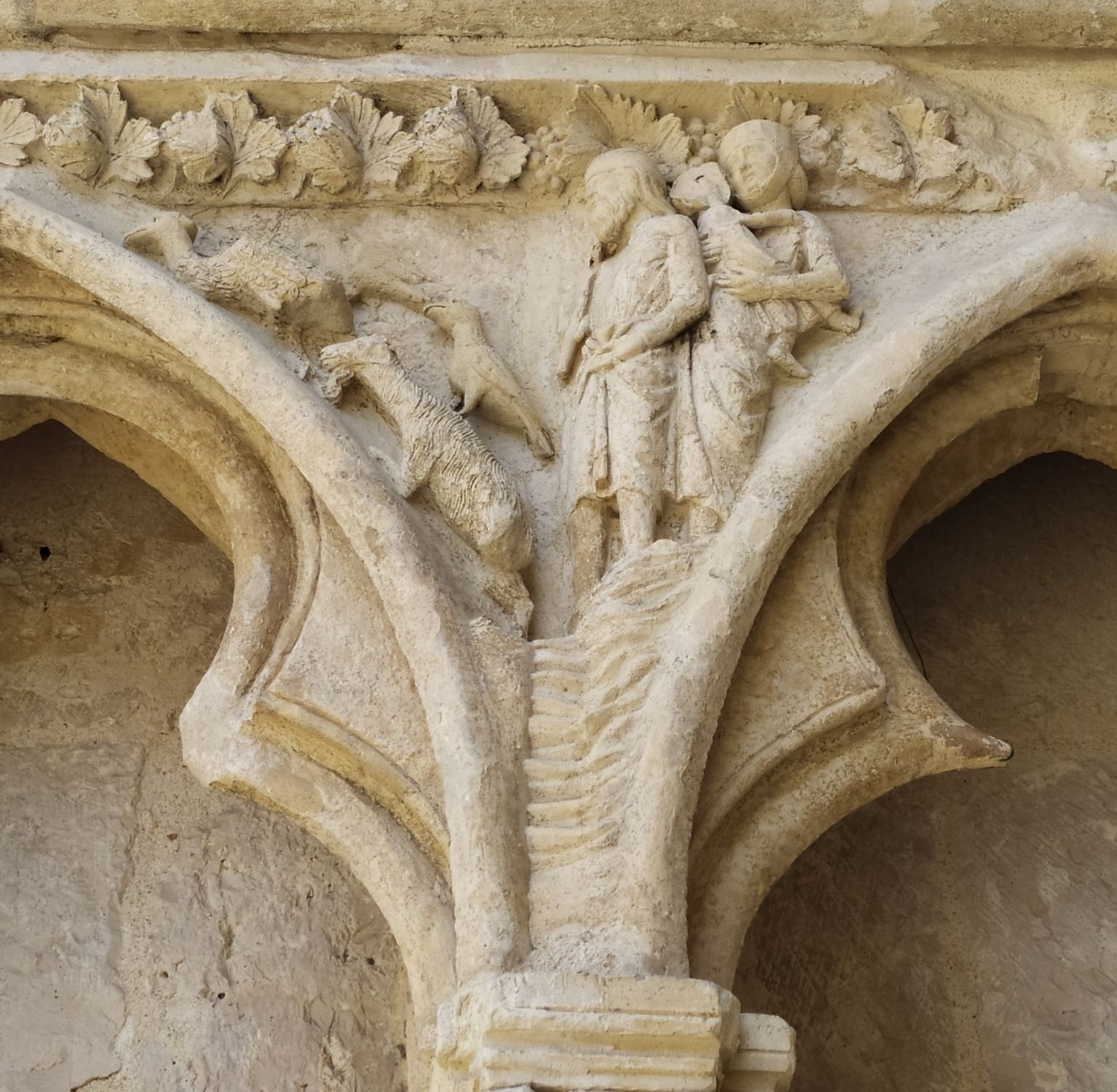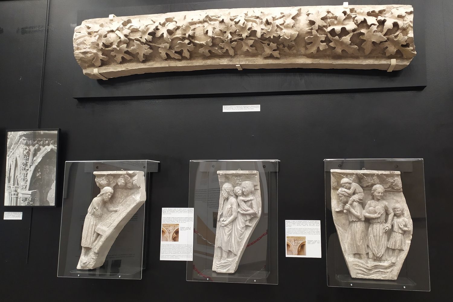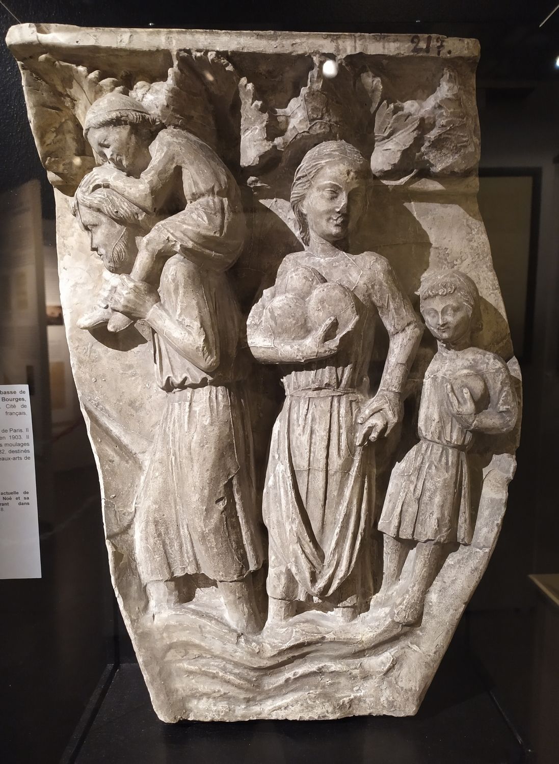 - Moulage en plâtre du quatrième écoinçon de l’arcature basse de l’ébrasement gauche du portail Saint-Étienne de la cathédrale de Bourges, Noé et sa famille rentrant dans l’arche, avant 1903. Cité de l’architecture et du patrimoine, Musée des Monuments français, MOU.05907