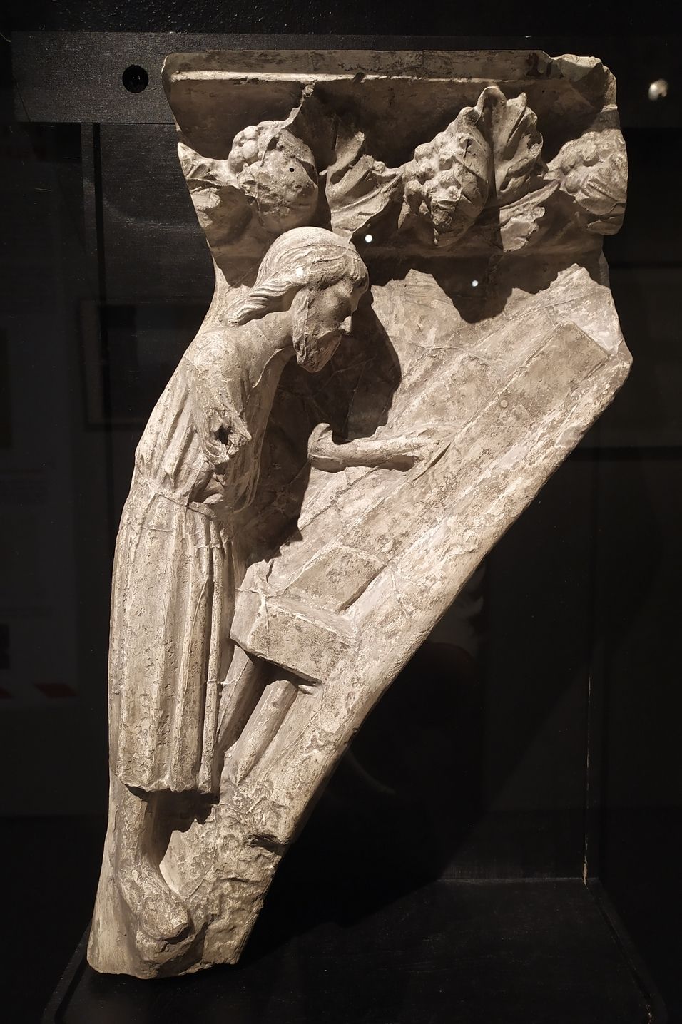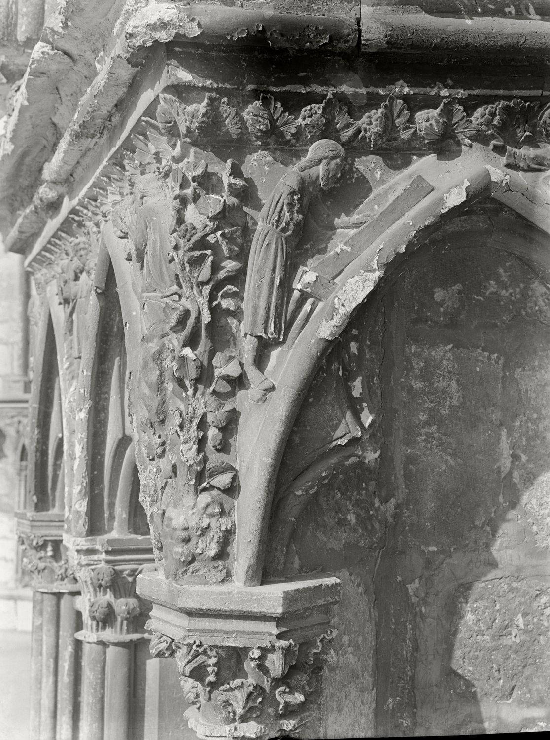 - Moulage en plâtre du premier écoinçon de l’arcature basse de l’ébrasement gauche du portail Saint-Étienne de la cathédrale de Bourges, Noé construisant l’arche, Charles Édouard Pouzadoux, 1906 [?]. Cité de l’architecture et du patrimoine, Musée des Monuments français, MOU.05906