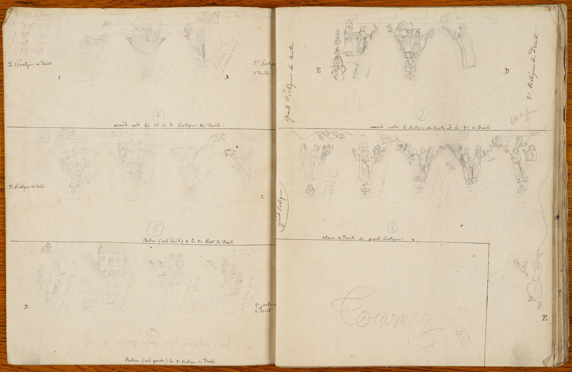 Dans l’encart n°6, les écoinçons du « retour (côté gauche) du 2e portique de droite » (portail de Saint-Étienne) correspondent en partie aux moulages exposés, avec les intitulés suivants : « Noé averti du déluge par dieu » pour Noé construisant l’arche, « Noé réunissant les animaux des différentes espèces », « Fuite de ceux qui évitent le déluge » pour la famille de Noé entrant dans l’arche.