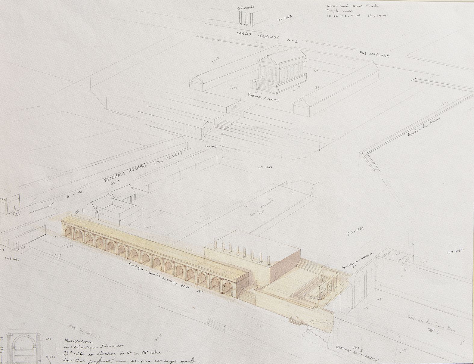 Les restitutions ont été réalisées d’après les dessins d’Alexis Luberne (1996-1999) et montrent l’utilisation d’assises de briques dans les niches et l’hypothèse d’un petit bassin entre contrebas de la fontaine qui expliquerait la découverte d’un bloc de pierre percé d’une bouche d’eau. Les niches ne permettant pas la circulation sous les arcades, le terme portique couramment utilisé est impropre et devrait être remplacé par arcature.Les restitutions ont été réalisées d’après les dessins d’Alexis Luberne (1996-1999) et montrent l’utilisation d’assises de briques dans les niches et l’hypothèse d’un petit bassin e contrebas de la fontaine qui expliquerait la découverte d’un bloc de pierre percé d’une bouche d’eau. Les niches ne permettant pas la circulation sous les arcades, le terme portique couramment utilisé est impropre et devrait être remplacé par arcature.