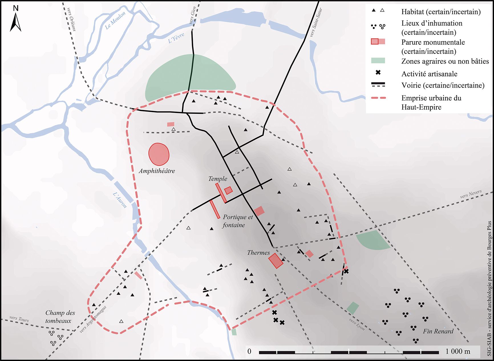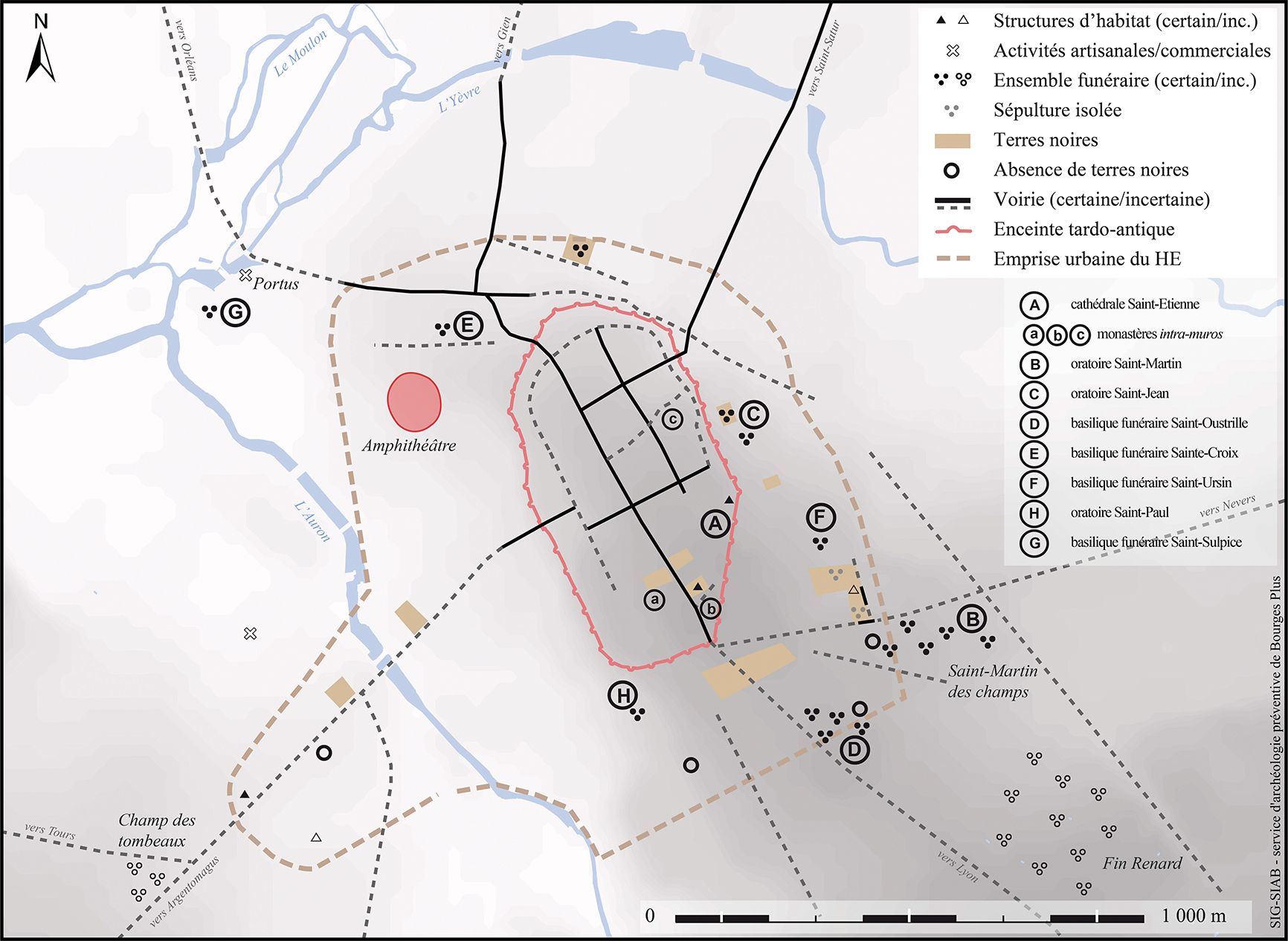 Cartes publiées dans Emmanuel Marot, Mélanie Fondrillon, Raphaël Durand, « Bourges et sa proche campagne durant l’Antiquité tardive (IIIe-VIIe siècles) à la lumière des fouilles récentes », in Marie-Pierre Chambon, Sylvie Crogiez-Pétrequin, Alain Ferdière, Sylvain Janniard (dir.), L’Antiquité tardive dans le Centre et le Centre-Ouest de la Gaule (IIIe-VIIe siècles), colloque international L’Antiquité Tardive en Gaule ATEG VI (Tours, 2018), Tours : FERACF, coll. « Suppl. à la Revue Archéologique du Centre de la France », 81, 2022, p. 189‑208.