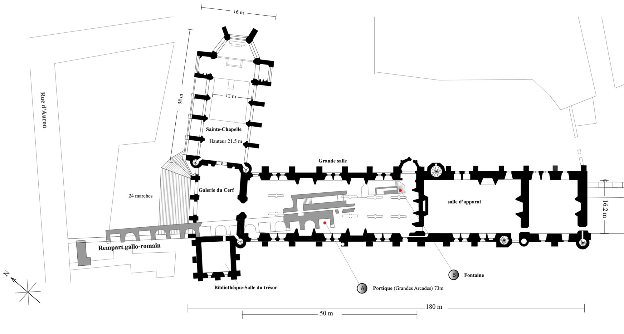 Le palais ducal était une construction monumentale dont l’entrée, magnifiée par un escalier d’honneur, se faisait par un large porche qui desservait, à l’est, la Sainte-Chapelle, au sud, la grande salle, et, à l’ouest, le trésor et la bibliothèque, symbolisant la puissance spirituelle, le pouvoir temporel et la richesse du duc Jean. À la suite de la grande salle de 850 m2, chauffée par cinq cheminées dont une à triple foyer, se développaient deux salles d’apparat puis le « petit palais » qui accueillaient les pièces privatives des logis du duc et de la duchesse.