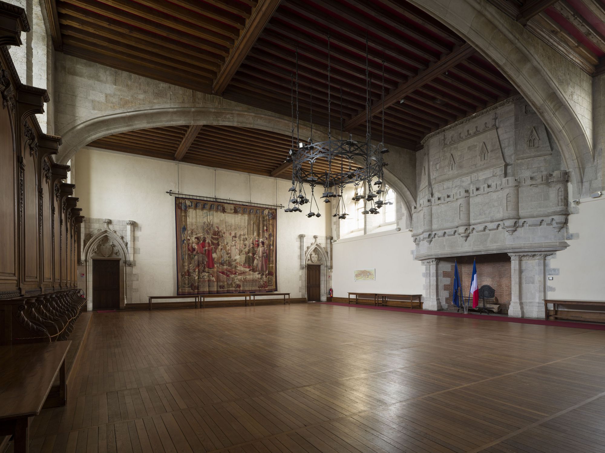 La salle du duc Jean et la salle des pas perdus, ou le vestibule, qui la précède constituaient une seule et même pièce de 424 m2 à l’origine. Il s’agissait d’une chambre de parement, la salle d’apparat qui suivait immédiatement la grande salle ducale dont les fondations sont encore conservées en sous-sol. La subdivision de la chambre remonte aux restaurations du début du XXe siècle, engagées par le Département sous la direction de Paul Boeswillwald, inspecteur des Monuments historiques, pour la tenue des séances du Conseil général, devenu Conseil départemental. Les fenêtres à réseaux et la cheminée orientale ont été restaurés à partir des vestiges encore en place. En revanche, les tympans portant des écussons au-dessus des portes sont des inventions du sculpteur Henri Jossant, excepté celui de la porte qui reliait la chambre de parement à la grande salle (à droite, en entrant dans le vestibule).