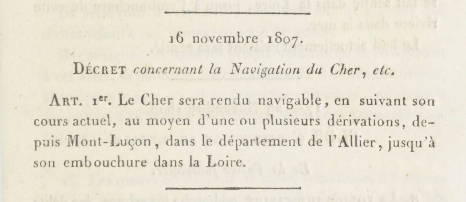 Bien que les différents projets du XVIIIe siècle aient finalement été abandonnés, Napoléon Bonaparte, devenu empereur des Français en 1804, a pour ambition de faire du pays un modèle de réussite dans une Europe qui commence à s’industrialiser. Souhaitant intégrer la France dans le projet de développement d’un réseau européen de navigation, il rend un décret relatif à l’ouverture à la navigation du Cher le 16 novembre 1807. Ce dernier acte l’aménagement de cette rivière pour permettre aux mariniers de rejoindre Paris par la Loire et les canaux de Briare et du Loing.