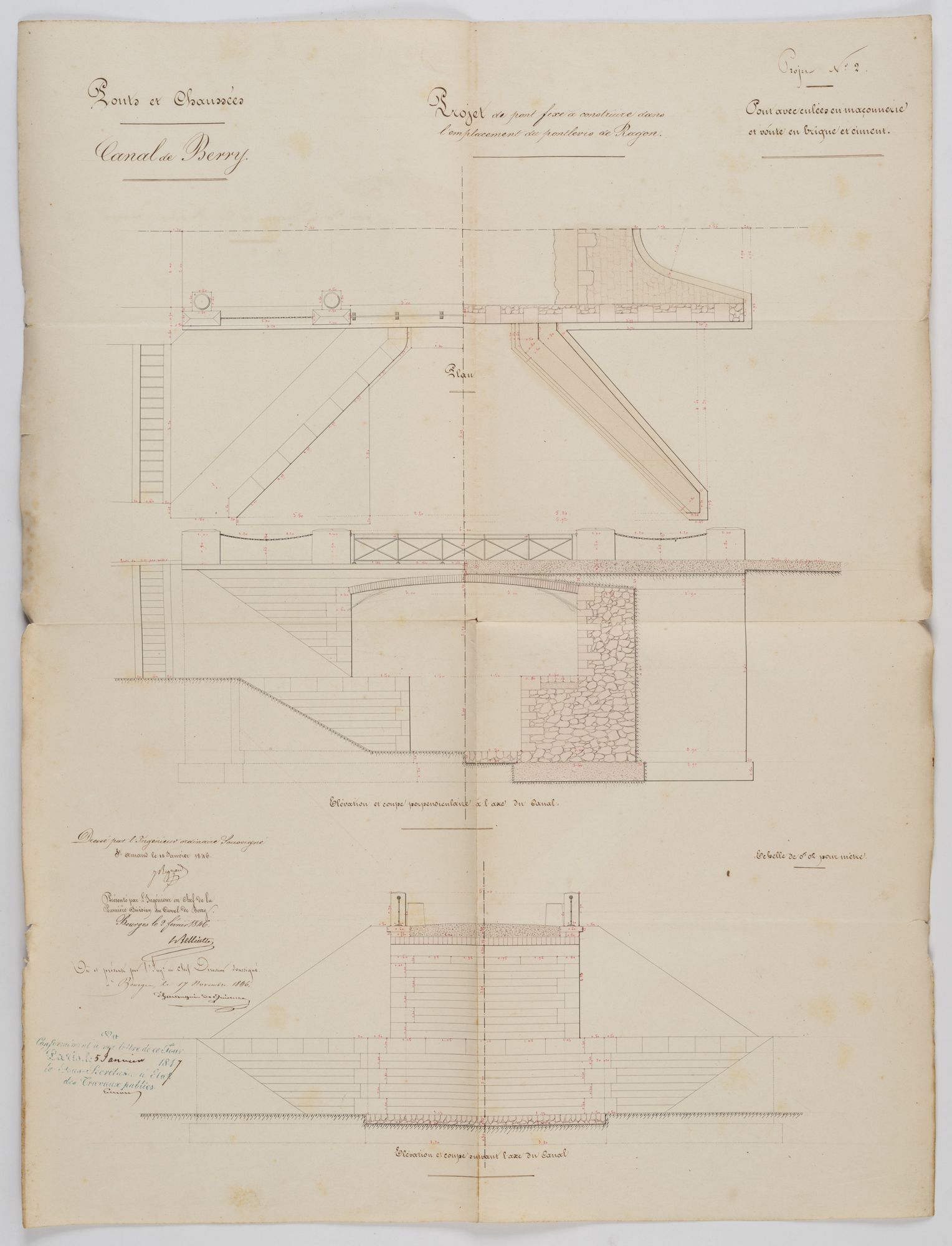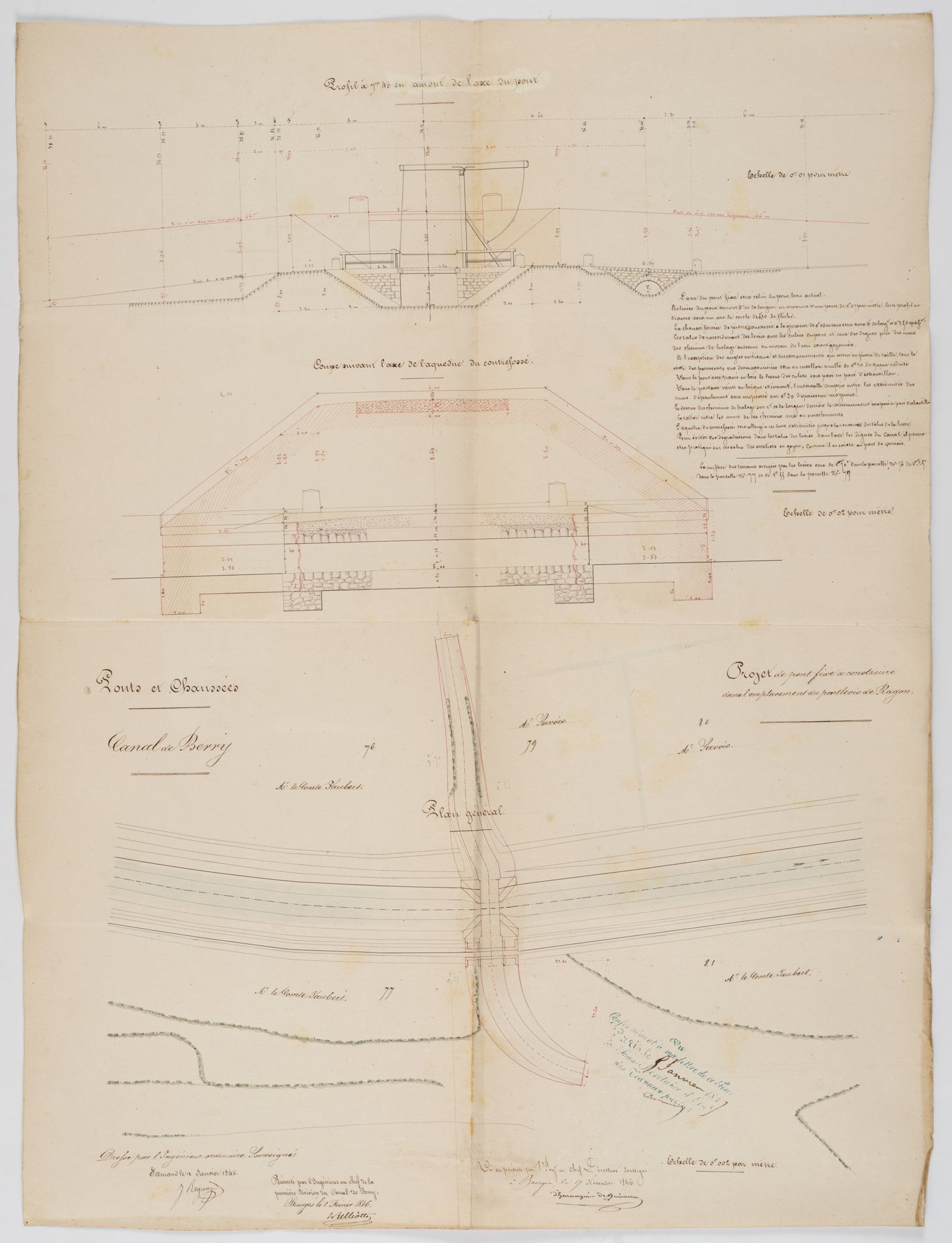 Projet de pont fixe à construire dans l’emplacement du pont-levis du Ragon au Chautay, plans, coupes et élévations, dressés par André Joseph Regnard, ingénieur ordinaire, et présenté par Eugène Belliotte, ingénieur en chef de la 1re division du canal, puis par Hyppolite d’Haranguier de Quincerot, ingénieur en chef directeur du canal de Berry, en 1846 (AD du Cher, 3 S 1208).