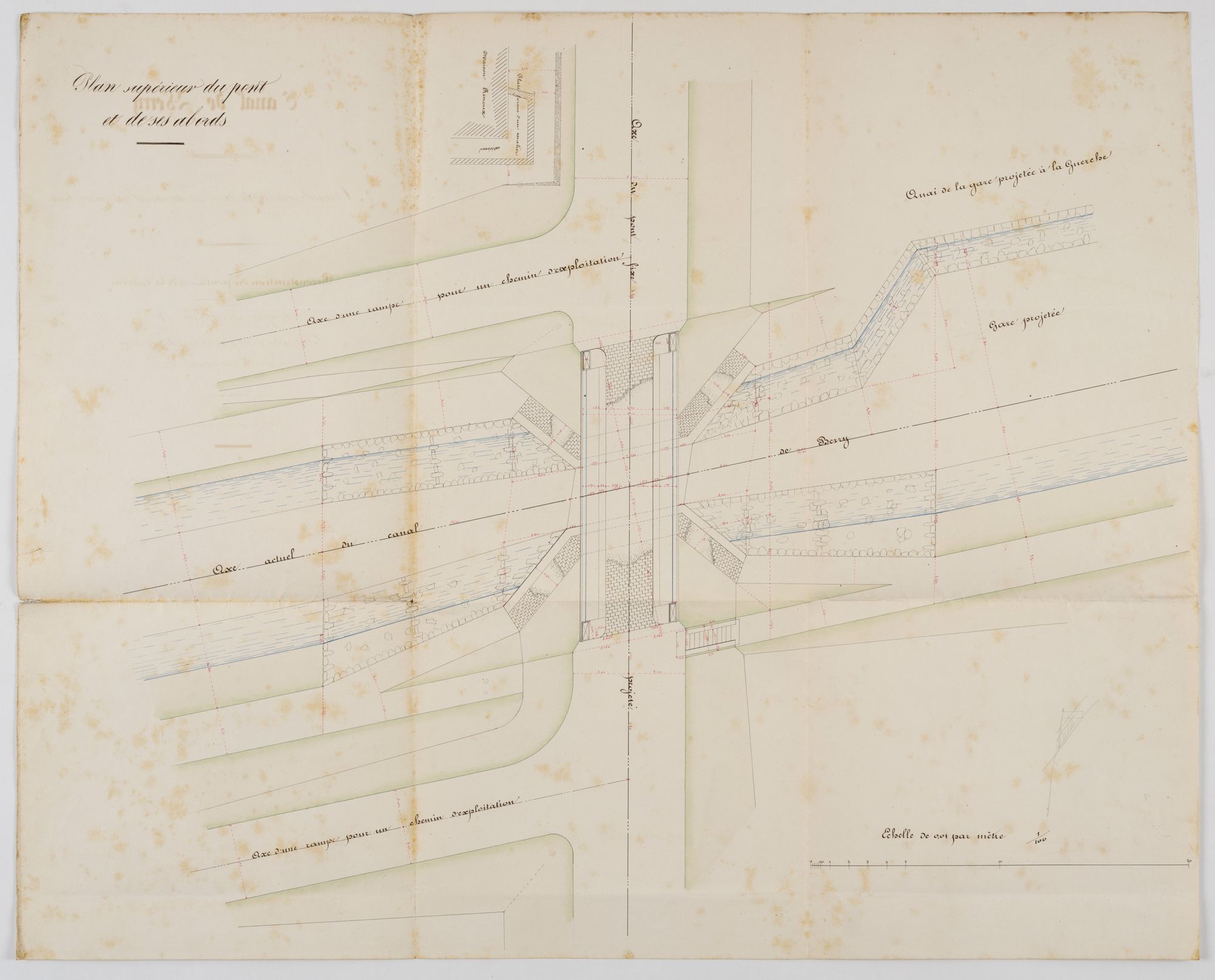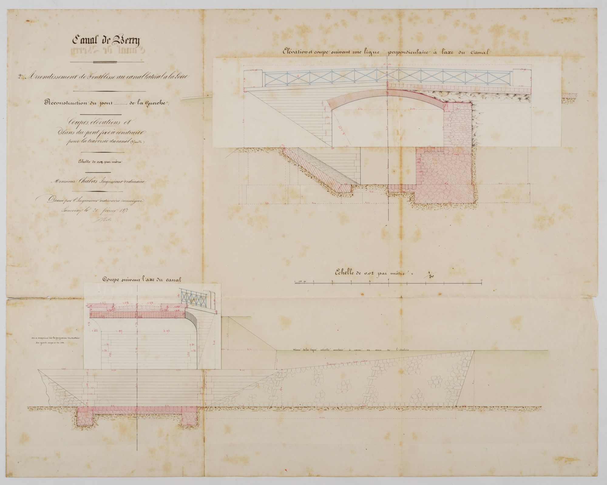Reconstruction du pont de La Guerche pour la traversée du canal, plans, coupes et élévations dressés par Frédéric Vincent Chabas, ingénieur ordinaire, le 20 février 1852 (AD du Cher, 3 S 1212).