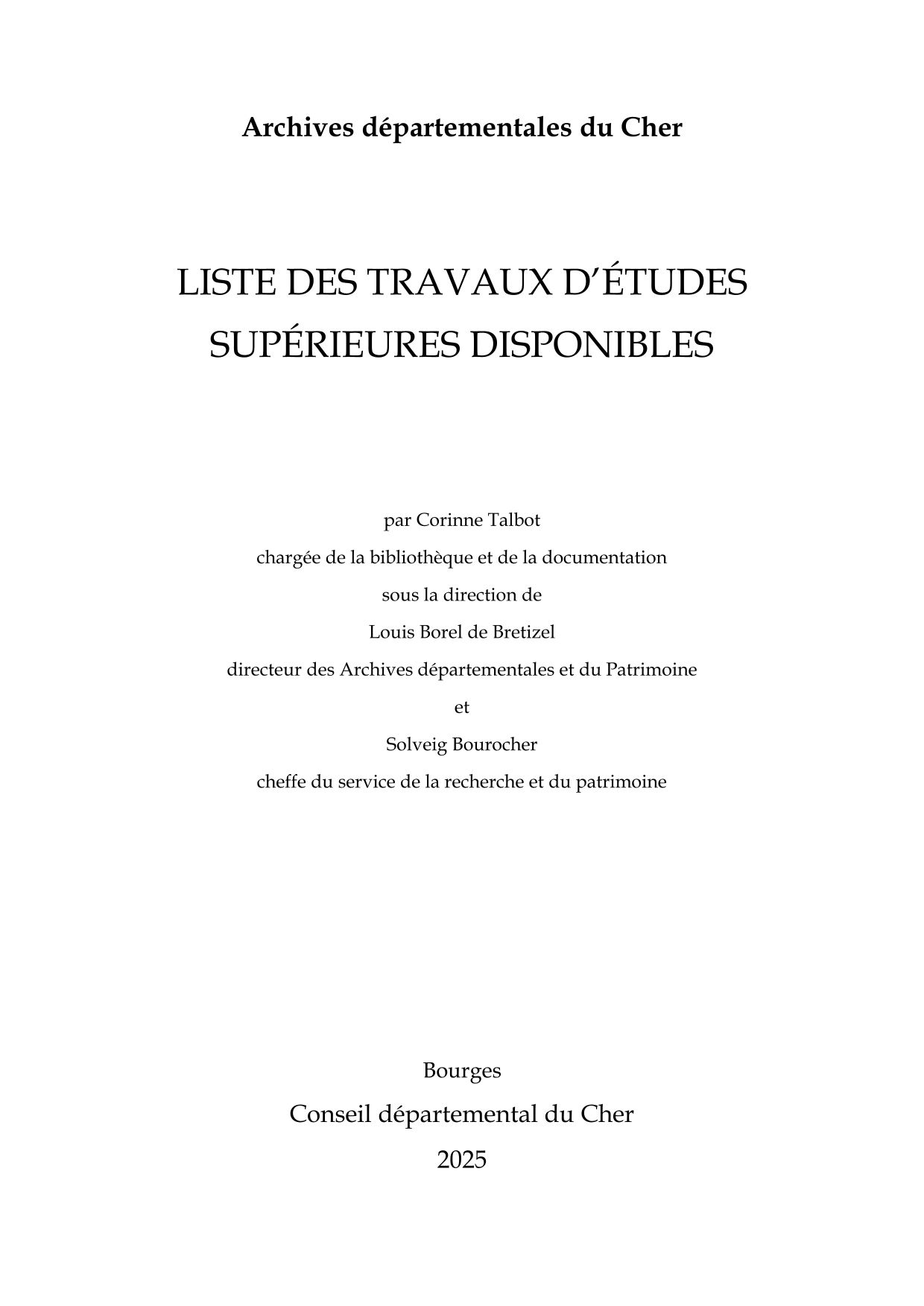 Les Archives départementales du Cher conservent au sein de la bibliothèque historique et des archives privées des travaux d'études supérieures versés par leurs auteurs. Il s'agit de mémoires de licence, maîtrise et master, des thèses de licenciés en droit ou de doctorat, des rapports de stage ou d'études universitaires.