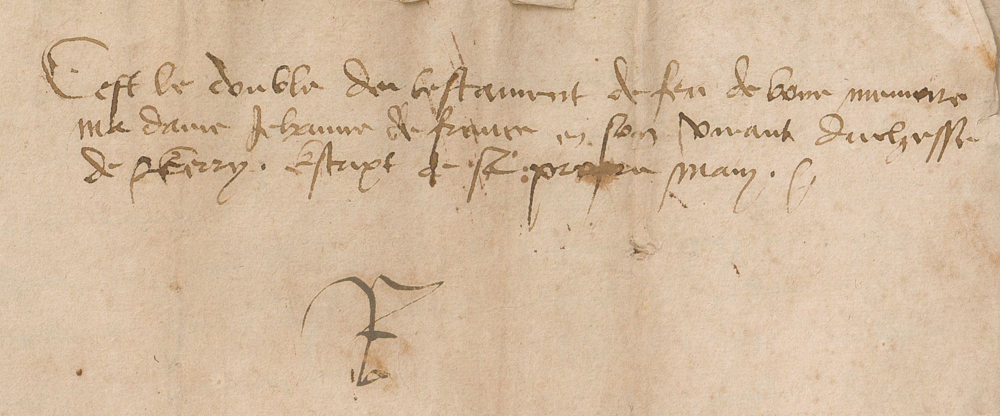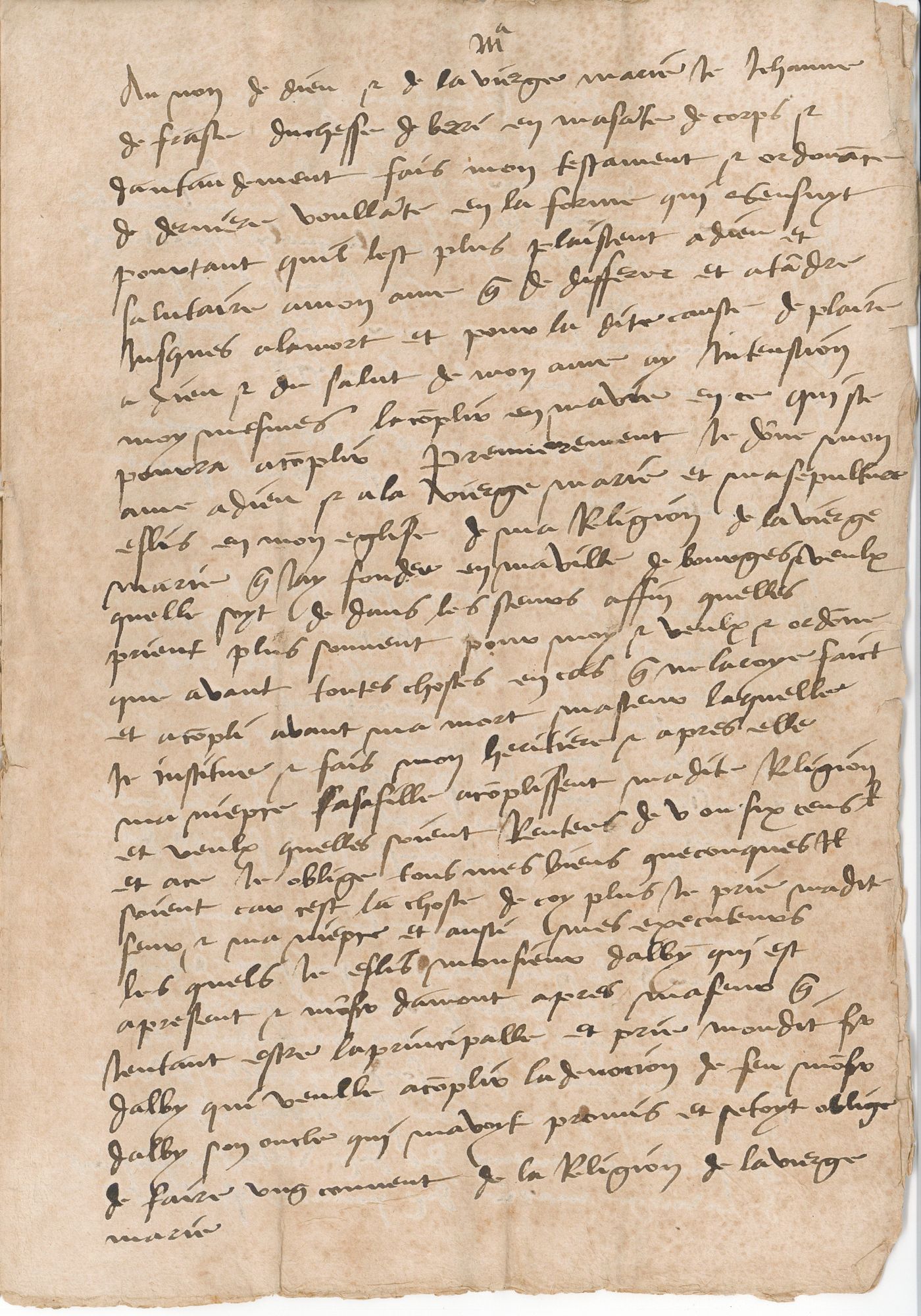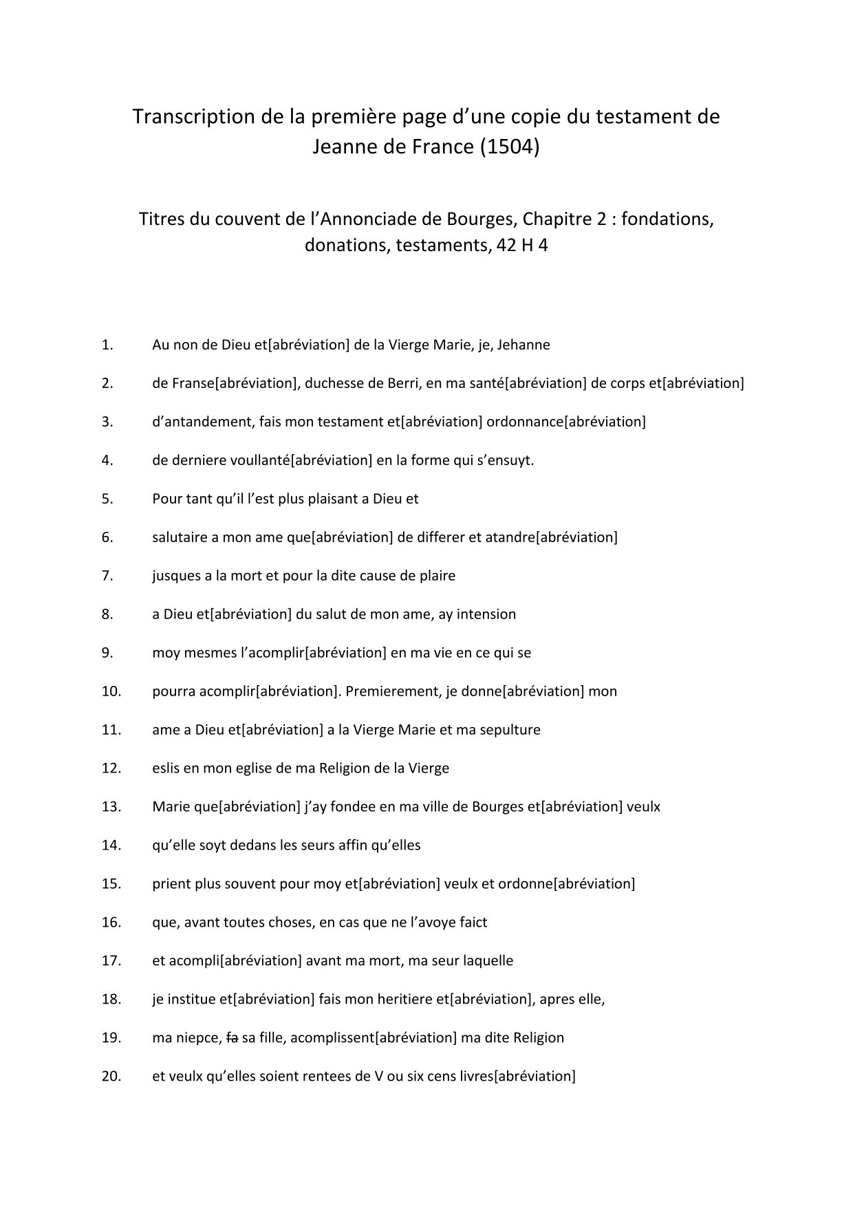 Le testament original de sainte Jeanne de France, datant du 10 janvier 1504, semble aujourd'hui perdu. Il en existe cependant plusieurs copies, dont celle-ci, conservée dans le fonds de l'Annonciade de Bourges (42 H 4) et contemporaine du décès de la dame (survenu le 4 février 1505) si l'on en croit son intitulé : « C'est le double du testament de feu de bonne memoire madame Jehanne de France, en son vivant duchesse de Berry, escript de sa propre main ». La première page, ici reproduite, ne présente que peu de difficultés de lecture avec seulement quelques abréviations et variations orthographiques qui peuvent, toutefois, dérouter le novice.