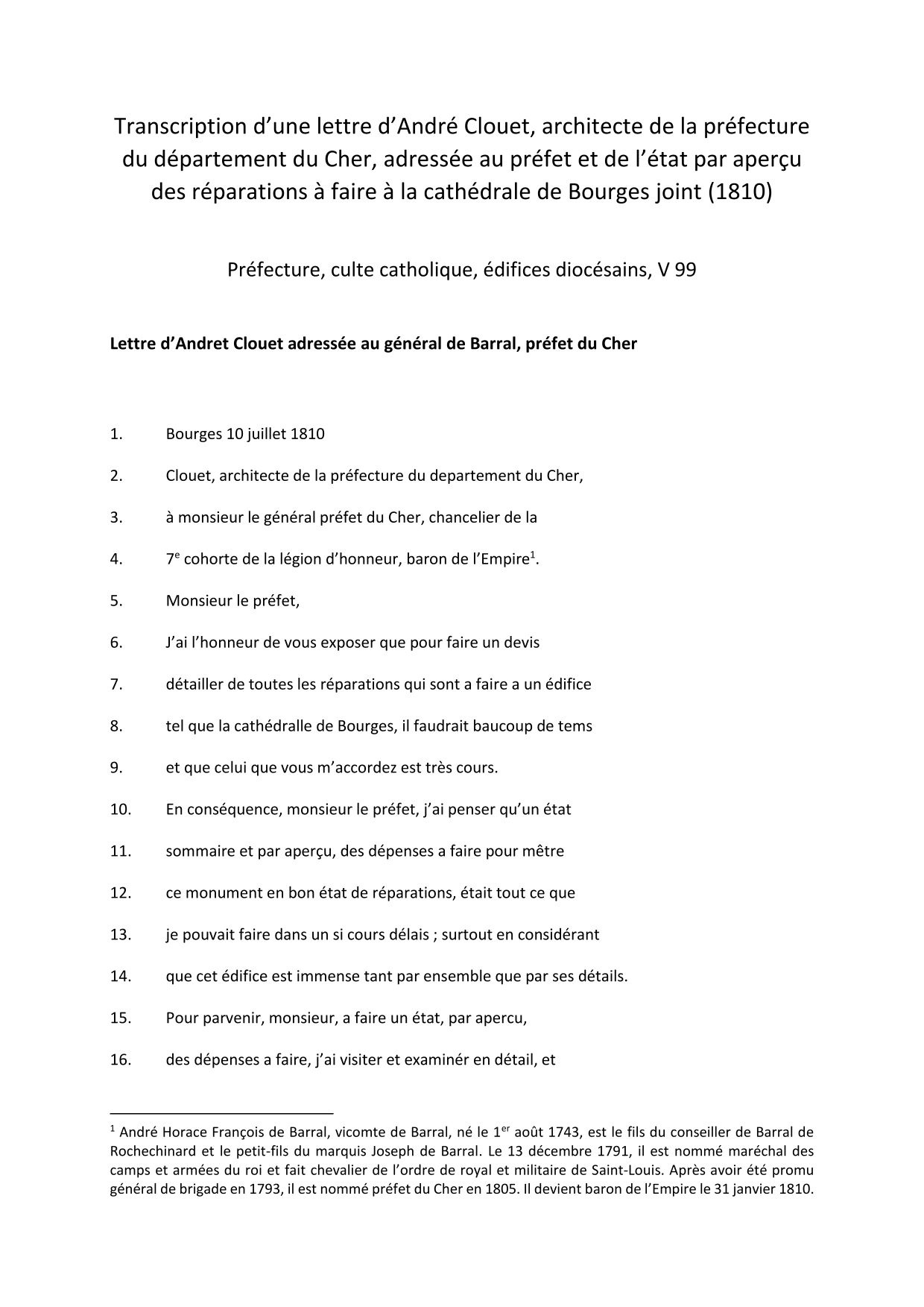 André Clouet (1756-1822), architecte de la préfecture du département du Cher et de la Ville de Bourges, dresse en juillet 1810 le premier état des réparations à faire à la cathédrale connu pour le XIXe siècle et conservé aux Archives départementales du Cher. Le document joint une lettre adressée au préfet du Cher, André Horace François de Barral, qui venait d'être nommé baron de l'Empire (31 janvier 1810).