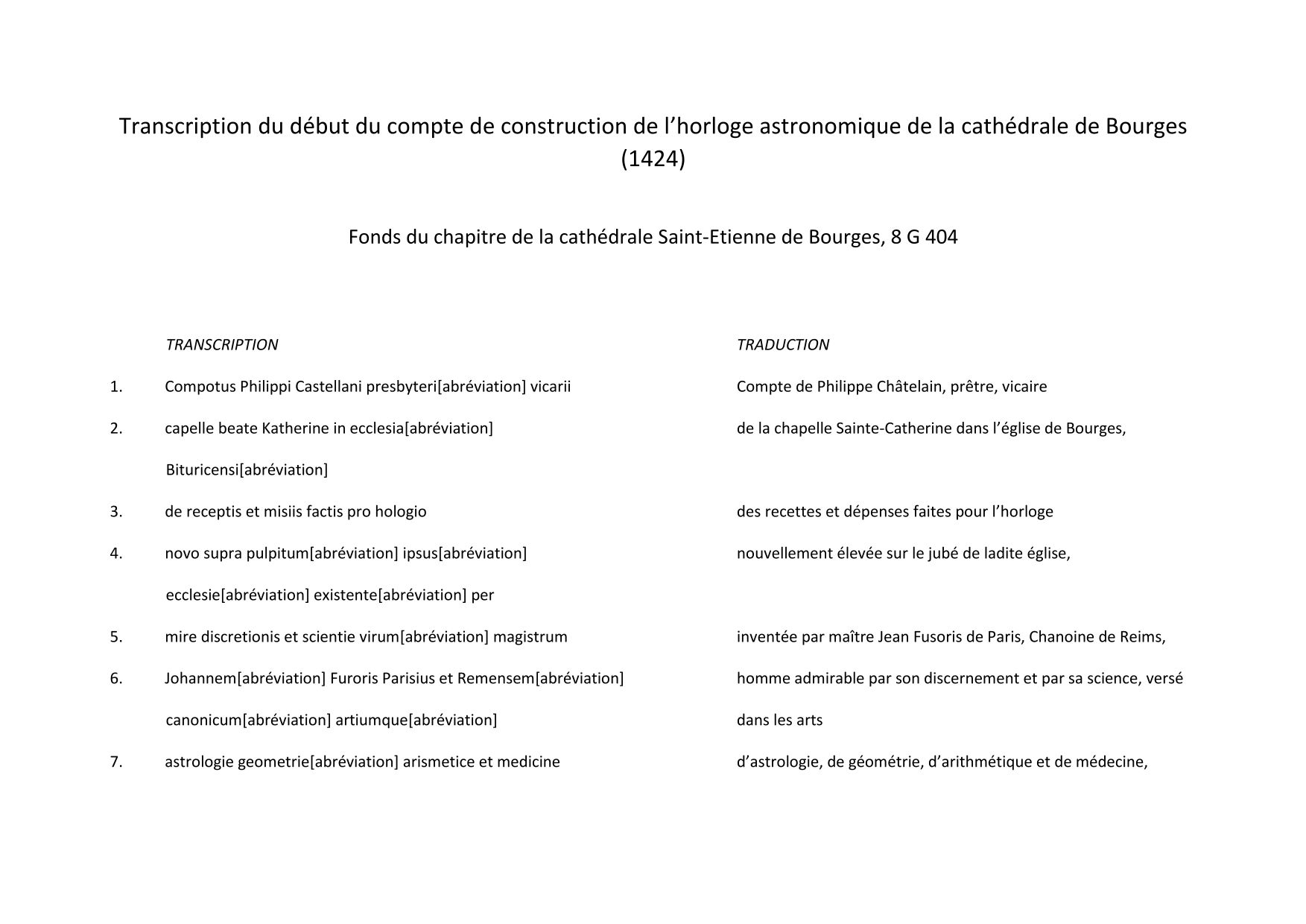 L'horloge astronomique de la cathédrale de Bourges est exceptionnelle à plusieurs titres. Elle est d'abord la plus ancienne horloge en fonctionnement conservée en France. Elle offre ensuite l'avantage d'être précisément datée et documentée grâce aux comptes originaux conservés aux Archives départementales du Cher. C'est le début de ce document, rédigé en latin, qui est reproduit ici.