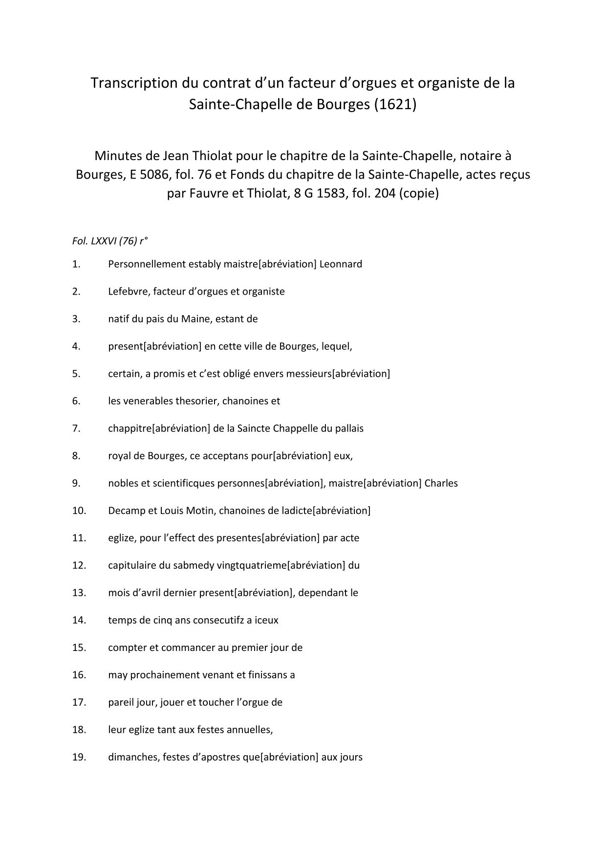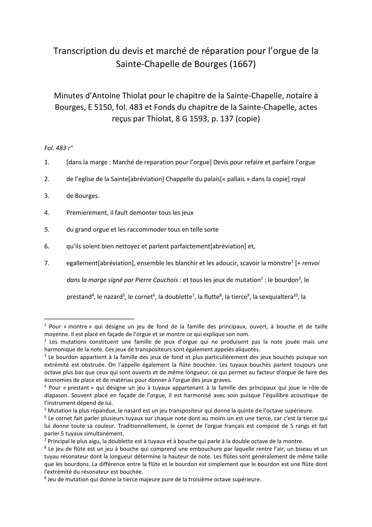 Sont présentés ici un contrat passé entre la Sainte-Chapelle de Bourges et Léonard Lefebvre, facteur d'orgues et organiste, le 28 avril 1621, et les devis et marché du 16 août 1667, par lesquels les chanoines confient la réparation de l'orgue à Pierre Chauchois qui travaillait déjà pour l'orgue de la cathédrale de Bourges.