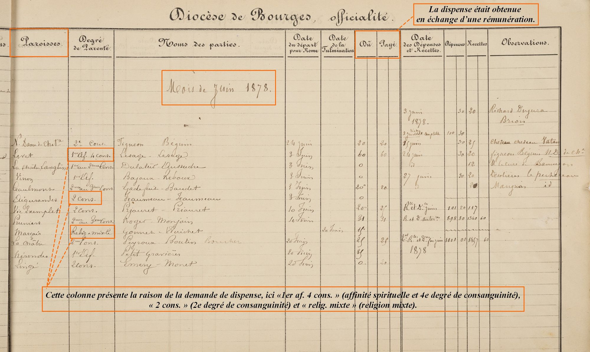 Les dispenses d’empêchement de mariage permettent de combler des lacunes dans l’histoire familiale. Elles mentionnent l’identité des demandeurs, le degré de parenté entre les époux (dans le cas de la consanguinité) et les motivations du couple à se marier. Les dispenses de consanguinité permettent de trouver des générations supplémentaires et d’enrichir les arbres généalogiques. À cela s’ajoute une enquête menée par la paroisse, riche de témoignages qui permettent de saisir les enjeux liés au mariage.