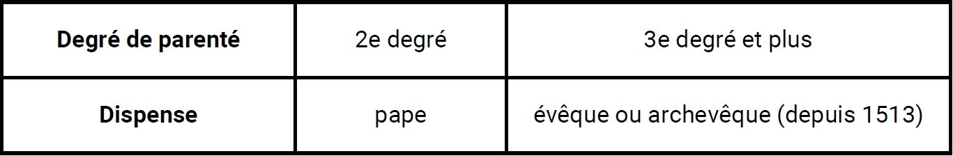 Depuis le Concile de Latran IV de 1215, le mariage est autorisé entre parents jusqu’au 4e degré canonique (auparavant, le mariage était interdit jusqu’au 7e degré).