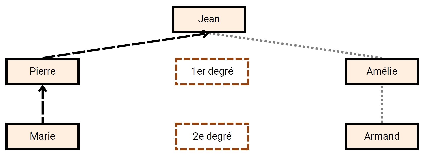 Par exemple, si l’on veut calculer le degré canonique de parenté entre Marie et Armand il faut regarder le nombre de générations qui les sépare de Jean. Ils font partie de la 2e génération à la suite de Jean. Donc le degré canonique entre Marie et Armand est de 2.