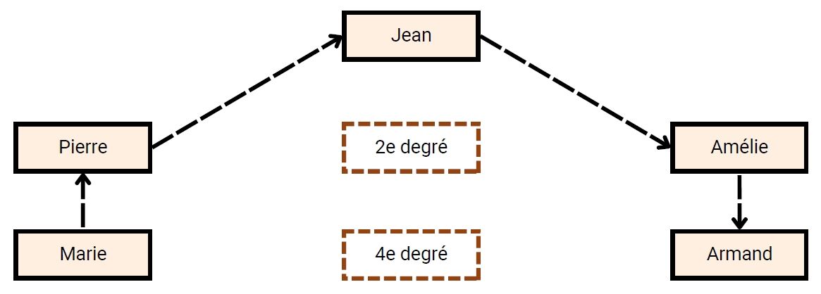 Par exemple, on compte 2 branches entre Pierre et Amélie qui sont cousins au 2e degré et 4 branches entre Marie et Armand, cousins au 4e degré.