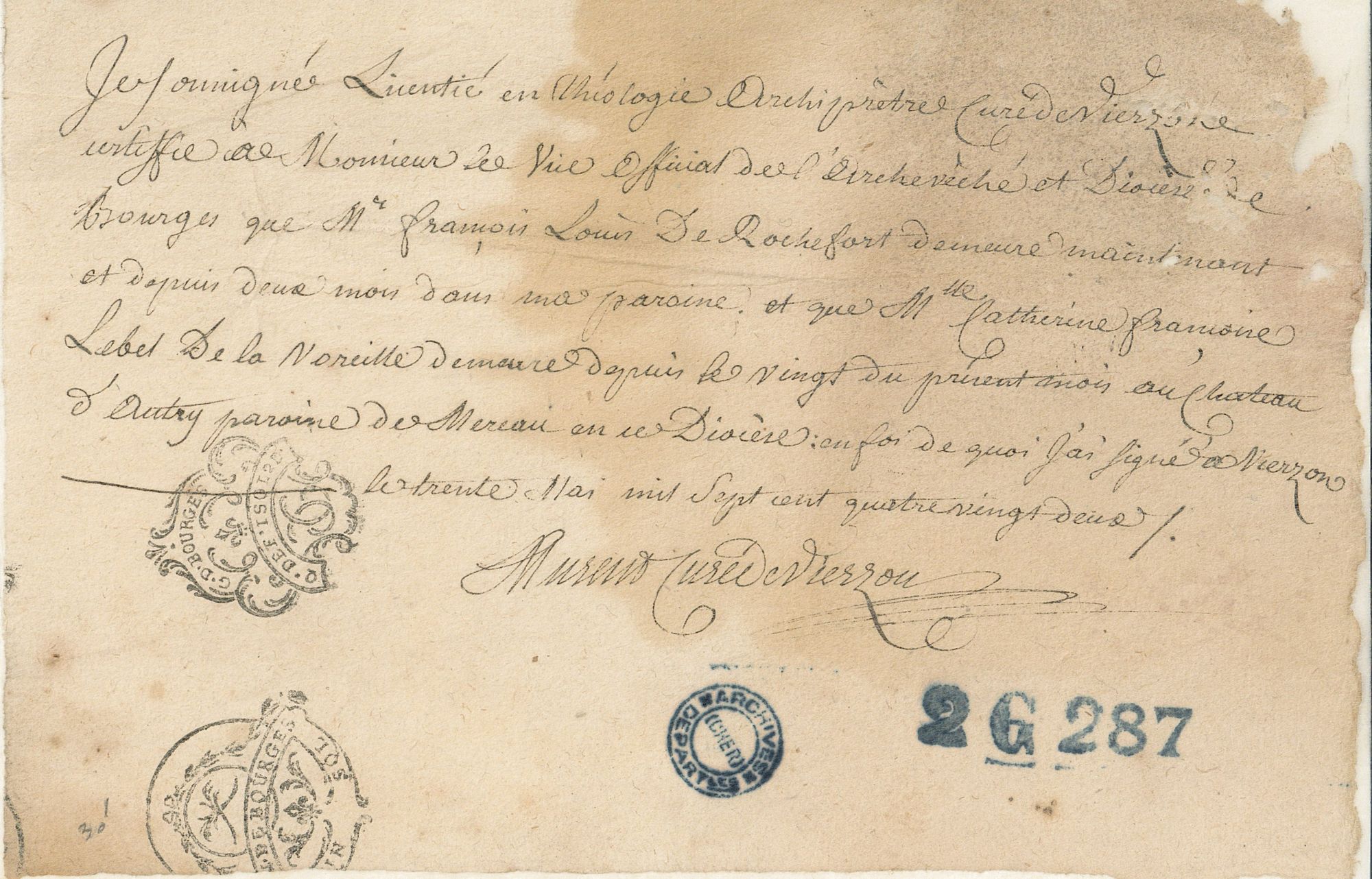 « Je soussignée, licencié en théologie, archiprêtre, curé de Vierzon, certifie à Monsieur le vice official de l’archevêché et diocèse de Bourges que Mr François Louis de Rochefort demeure maintenant et depuis deux mois dans ma paroisse et que Mlle Catherine Françoise Lebel de la Voreille demeure depuis le vingt du présent mois au Chateau d’Autry, paroisse de Mereau en ce Diocèse ; en foi de quoi j’ai signé à Vierzon le trente mai mil sept cent quatre-vingt deux ».