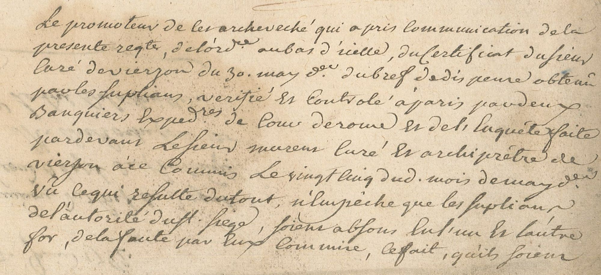 « Supplient humblement François Louis de Rochefort et Catherine Françoise Lebel de la Voreille, pauvres habitans de la paroisse de Lury en ce diocèse. Disant qu’il a plû à sa sainteté leur accorder un bref d’absolution et de dispense de l’empechement du second degré de consanguinité qui est entre eux ; donné à Vienne en Autriche (...) ».