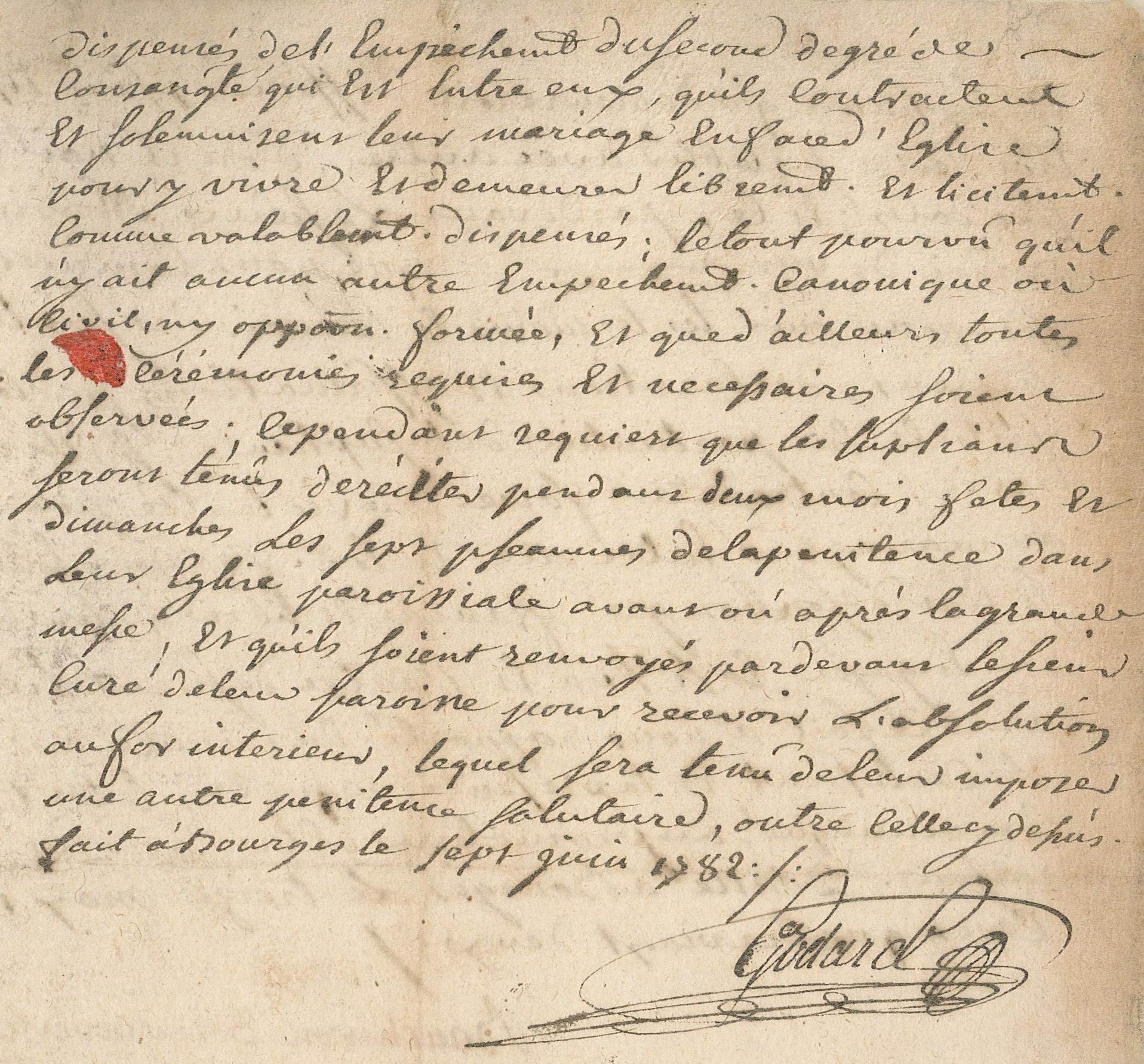 La dispense d’empêchement de mariage peut être inscrite à la fin de la supplique, comme c’est le cas de celle donnée par le promoteur. Après l’analyse des preuves, la dispense est donnée aux suppliants François Louis de Rochefort et Catherine Françoise Lebel de la Voreille par l’Officialité de Bourges le 7 juin 1782. Toutefois, les suppliants ne sont pas exemptés de faire pénitence pour absoudre leurs péchés :