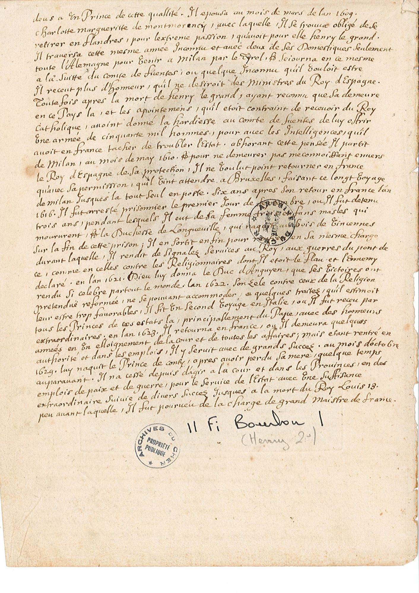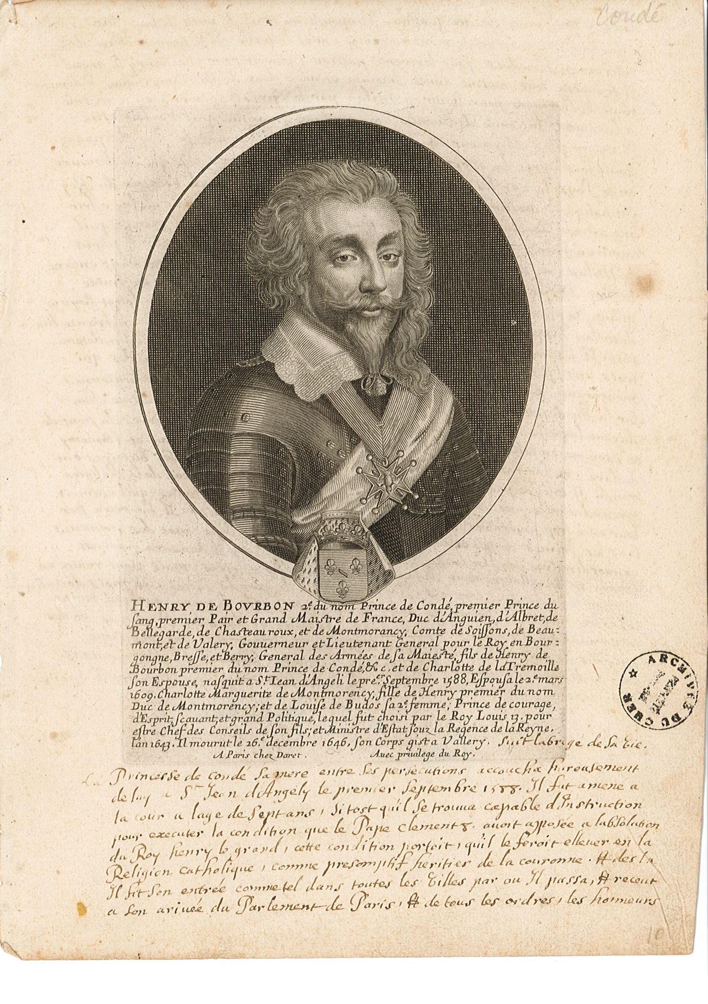 Portrait et biographie d'Henri II de Bourbon-Condé issus du fonds 11 Fi des AD du Cher.