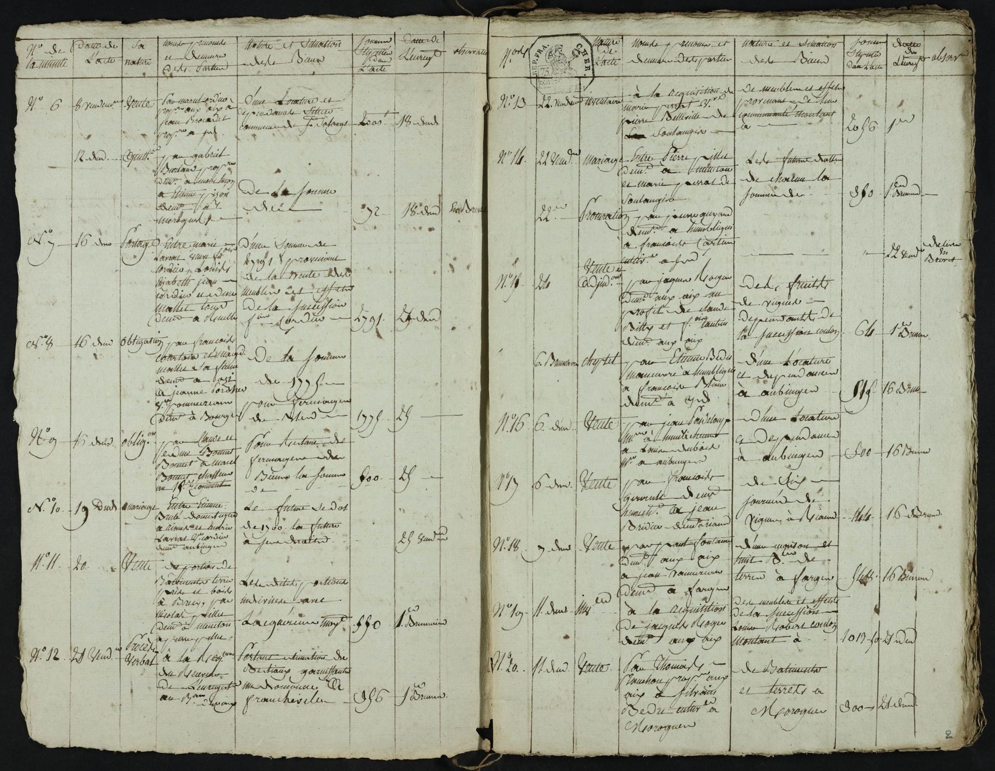 À partir du XIXe siècle, le notaire doit présenter ses registres sous la forme de tableaux codifiés de 7 colonnes :