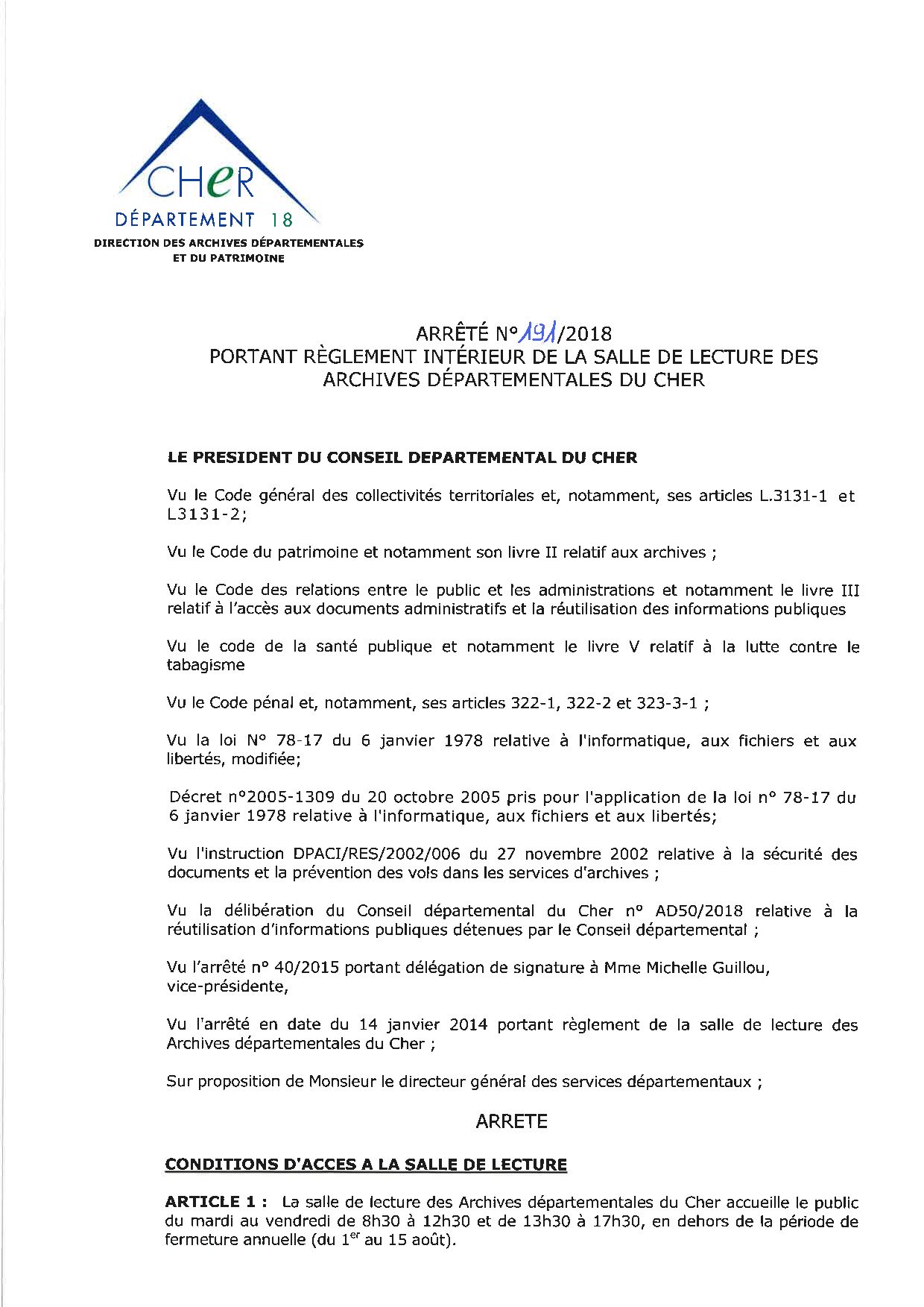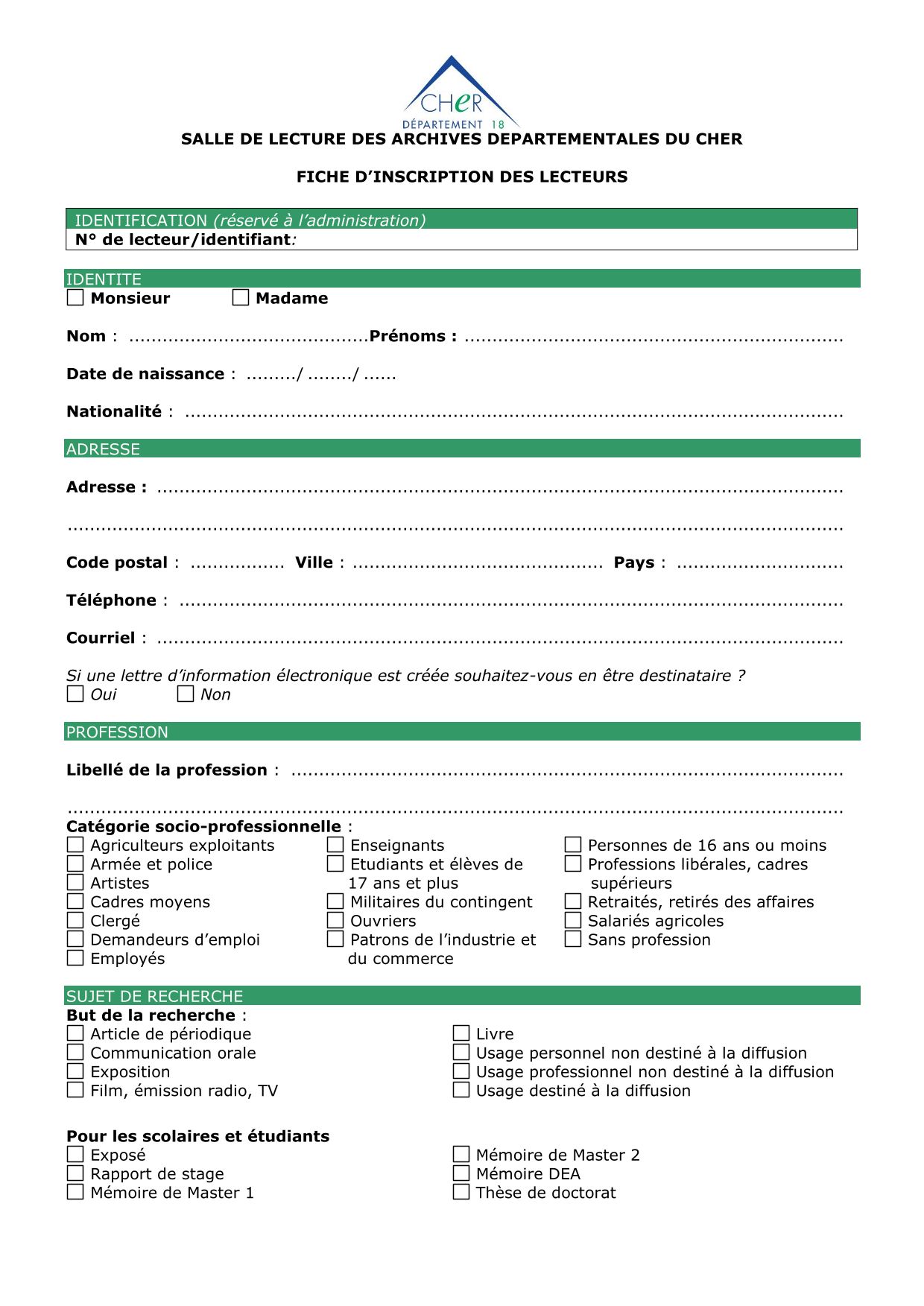 La salle de lecture est accessible gratuitement et sans rendez-vous à tous les usagers munis d'une carte de lecteur. Celle-ci est délivrée à l'accueil des Archives départementales du Cher sur simple présentation d'une pièce officielle d'identité (carte d'identité nationale, passeport, permis de conduire, titre de séjour) et après avoir rempli le formulaire d'inscription téléchargeable ci-dessous. Strictement personnelle, la carte de lecteur doit être renouvellée chaque année civile.