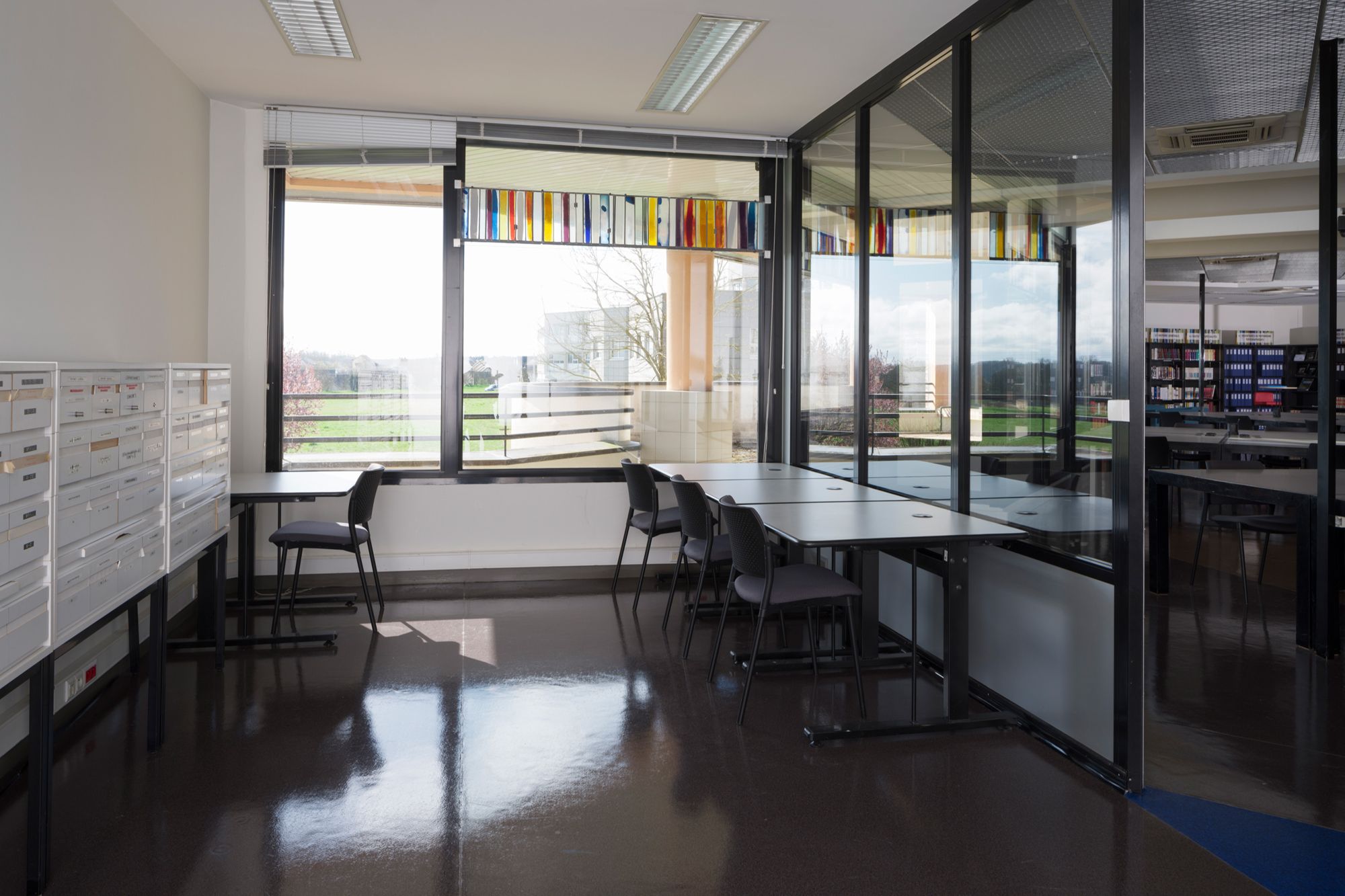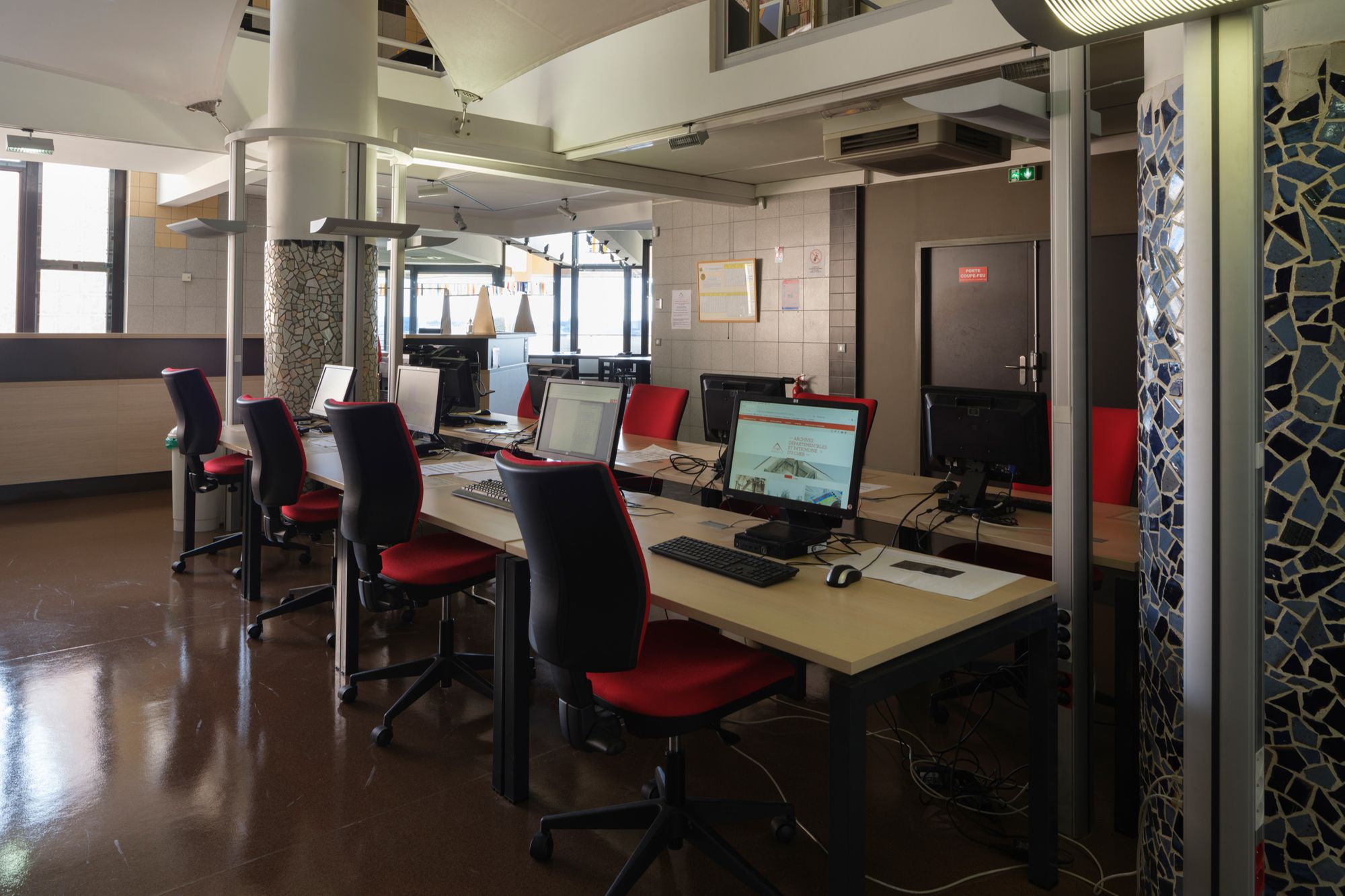 La salle de lecture des Archives départementales du Cher, conçue par l'architecte Jean-Marie Nunez, comporte sept panneaux de vitrail de Jean Mauret qui évoquent les dos des livres, registres et liasses d'archives sur des étagères.