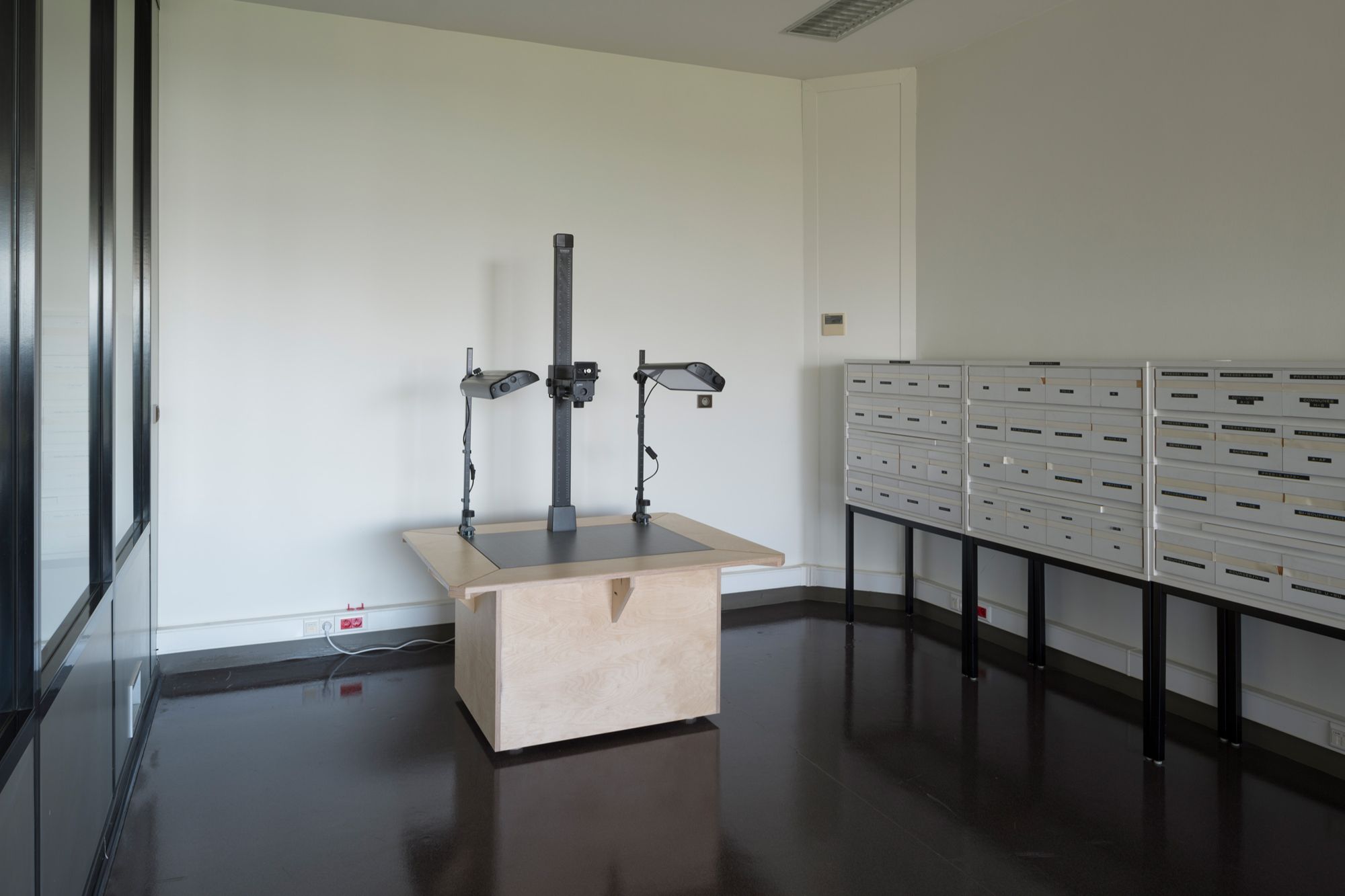 Un statif de reproduction avec éclairage réglable et plaque à quadrillage et échelle en cm est également mis à disposition des lecteurs dans l'annexe de la salle de lecture.