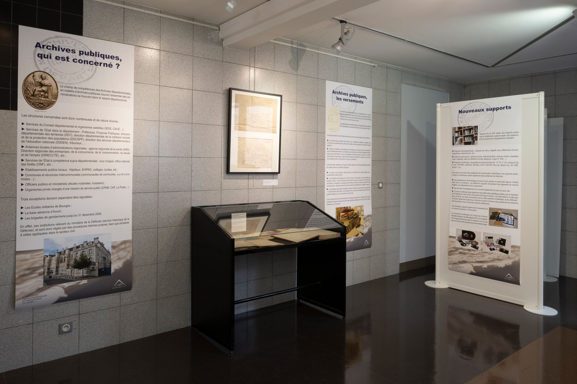 Les Archives départementales du Cher proposent des expositions temporaires à l'entrée de la salle de lecture, mettant en valeur les fonds et le travail des archivistes. Les expositions sont accessibles uniquement aux horaires d'ouverture de la salle de lecture.