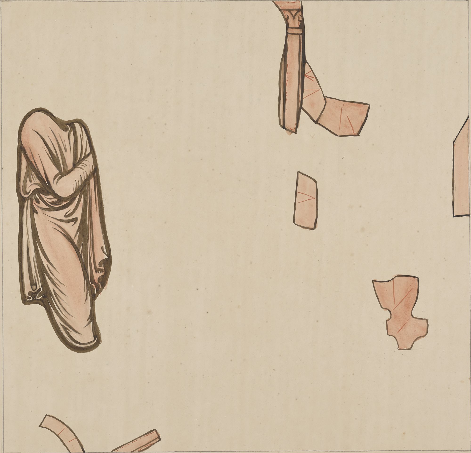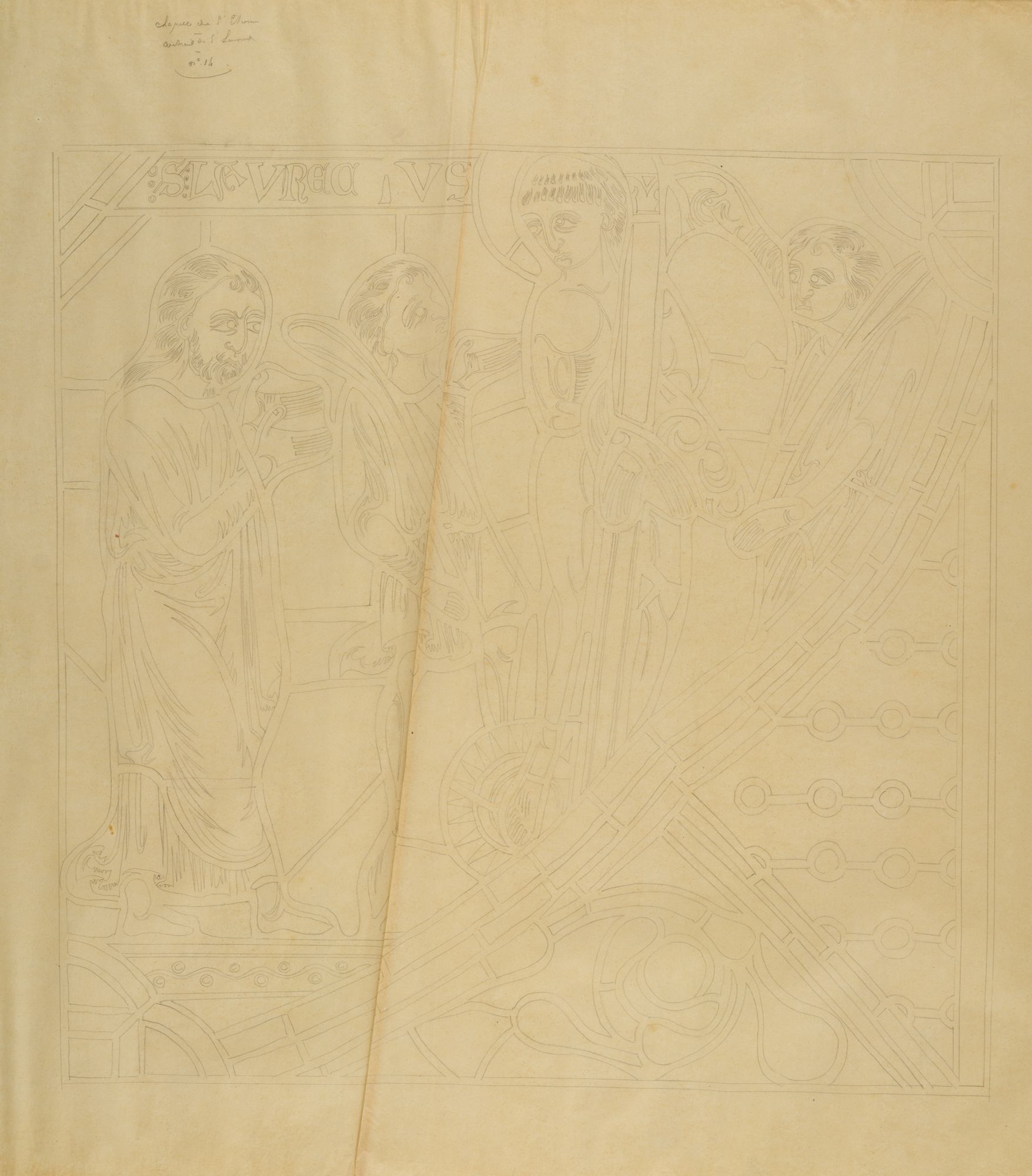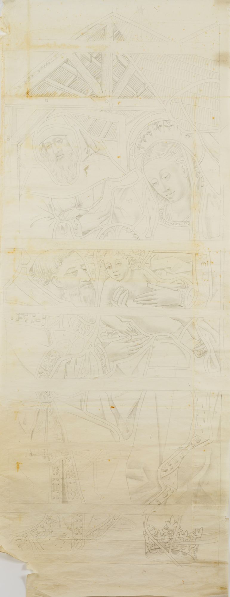 Très soigné et détaillé, ce relevé reproduit les contours des plombs, les barlotières en fer qui séparent les panneaux et les dessins des grisailles. Des notes indiquent les teintes des verres teintés dans la masse. L’auteur est probablement Félix Chédin ou Étienne Thévenot même si une attribution à l’un de leurs successeurs n’est pas exclue. Le style est ici différent des autres relevés présentés dans l’exposition puisque le vitrail de la chapelle Saint-Jean-Baptiste date de la fin du XVe siècle au contraire des vitraux du XIIIe siècle du déambulatoire.