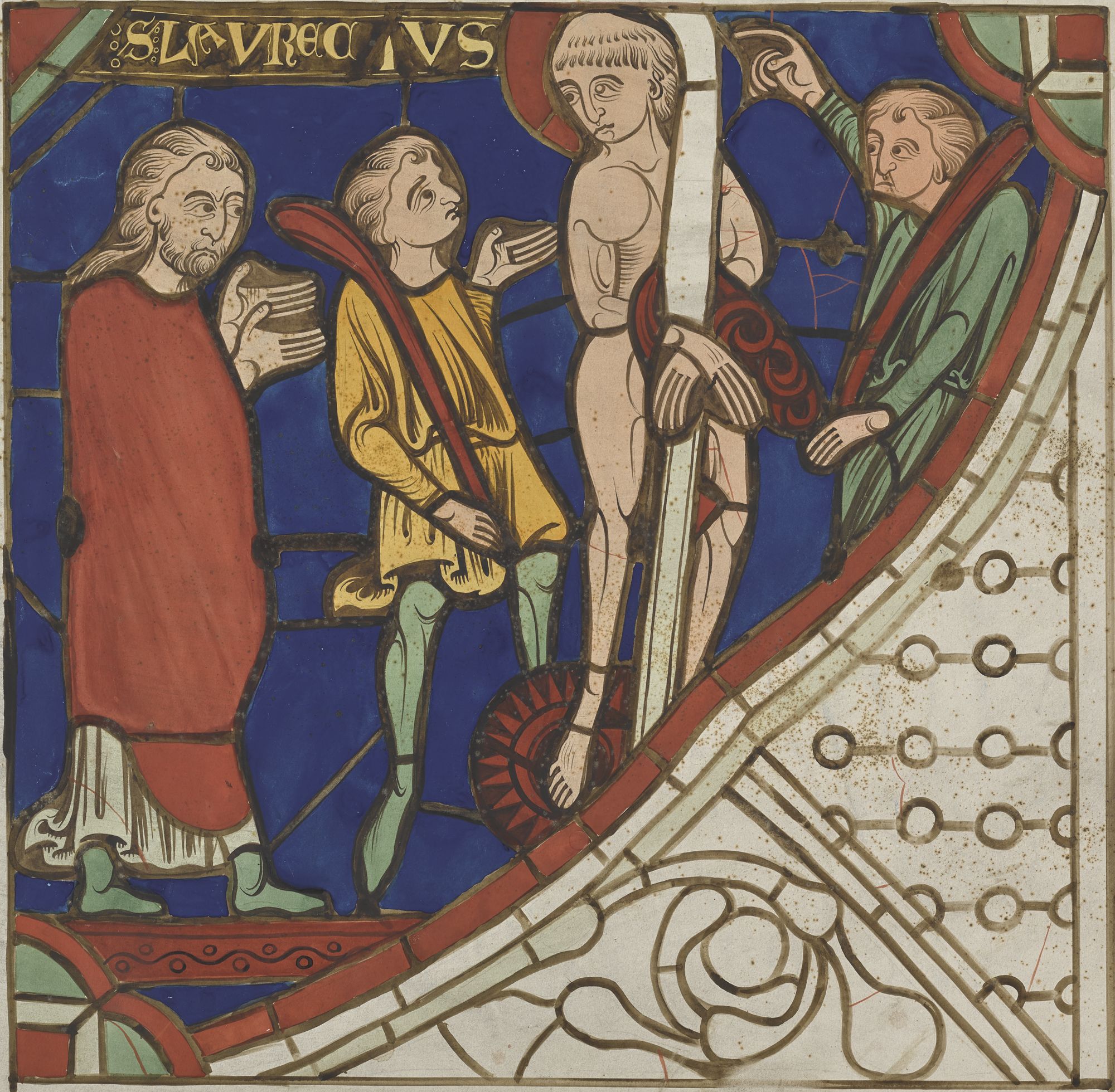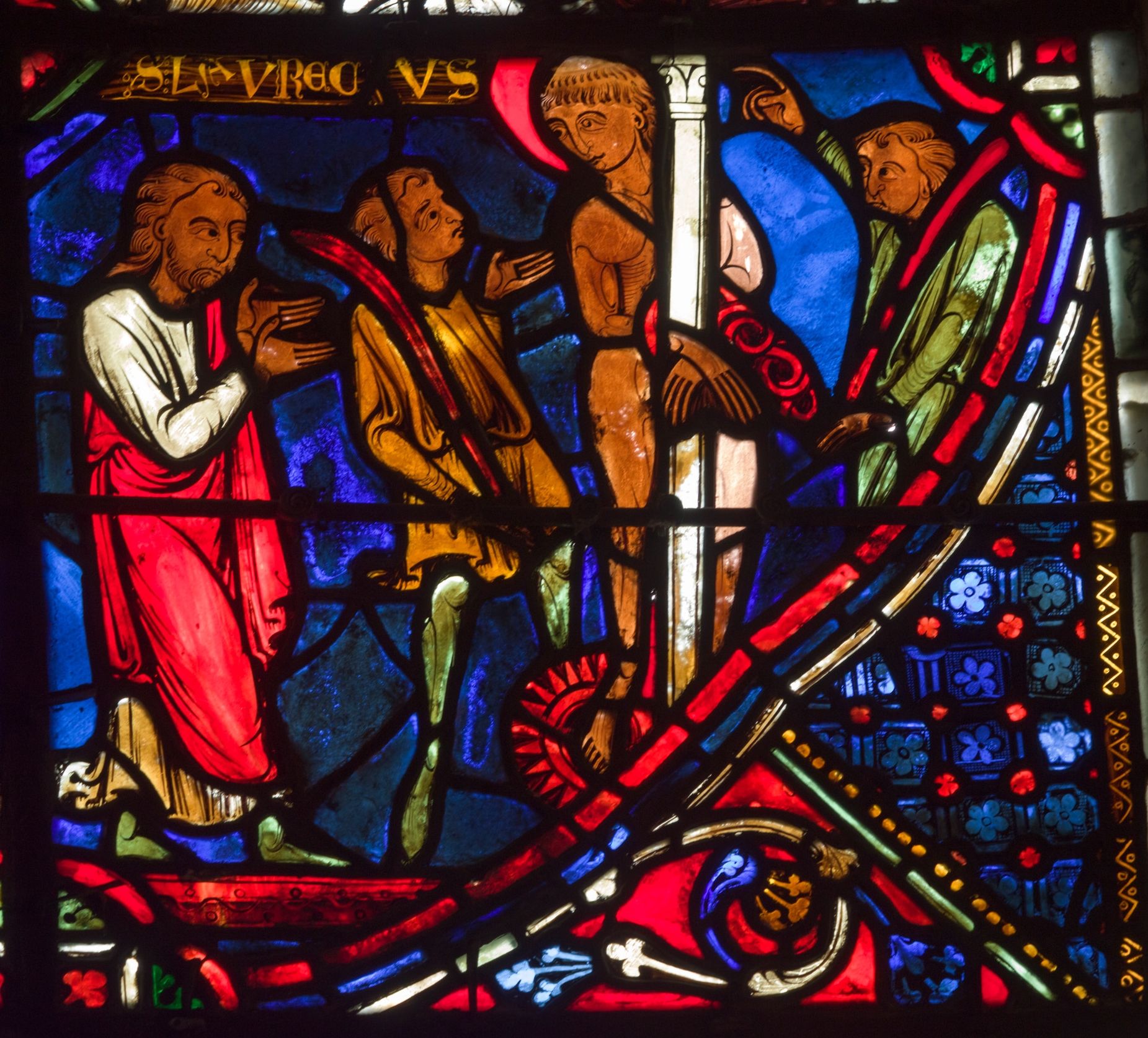 Panneau n°14 du vitrail de saint Laurent présentant saint Laurent flagellé, chapelle Saint-Étienne